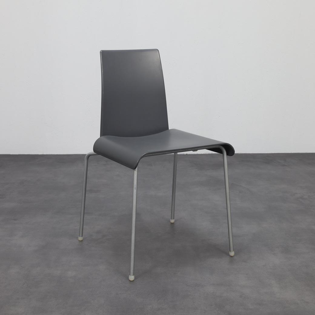 Suitable for both indoor and outdoor use, the chairs are made of a mix of plastic (seat and backrest), aluminium, and metal (frame). The colour is anthracite — understated and versatile, well-suited to a range of interiors or sheltered outdoor settings.