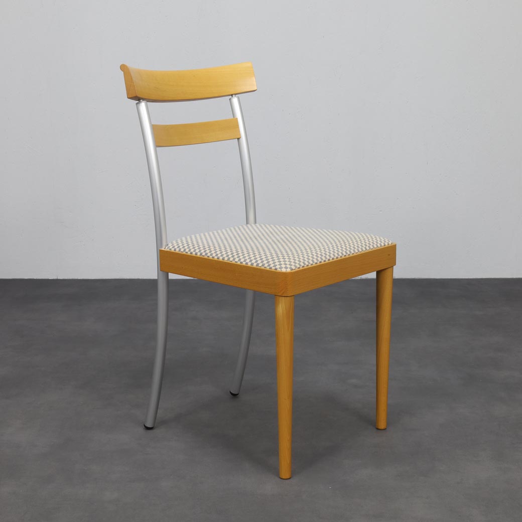 The chairs feature a light beechwood frame combined with silver-coloured metal backrests, creating a visual tension between warm and industrial elements. The seats are upholstered in a bold blue-and-white checkered fabric, unmistakably reflecting the visual language of the 1990s.