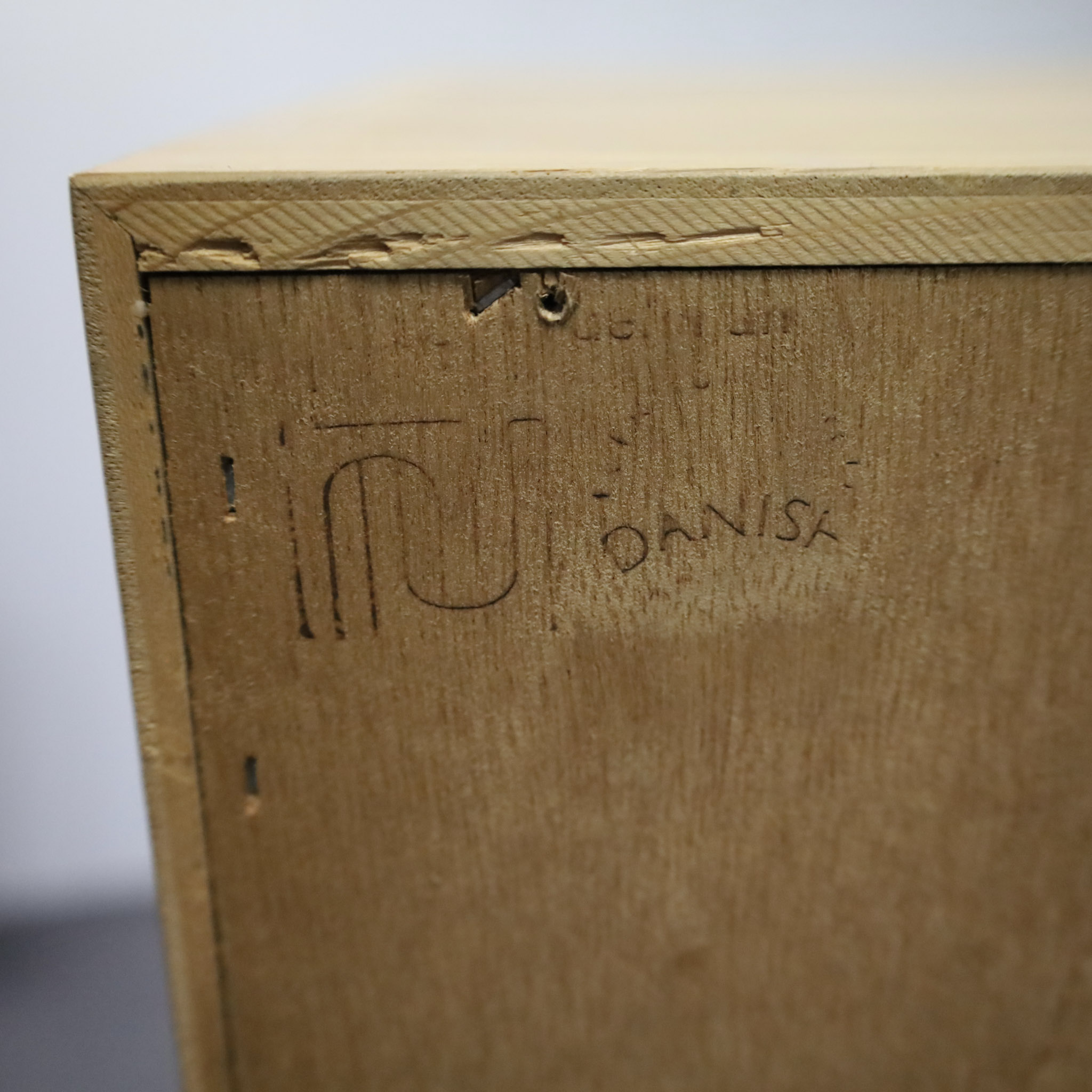 Crafted in oak veneer, the cabinet displays the warm tone and subtle grain patterns characteristic of Danish furniture from this period. The recessed handles are carved directly into the wood, reinforcing the minimalist aesthetic and allowing the surfaces to remain visually uninterrupted.