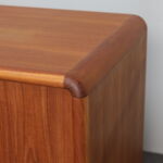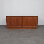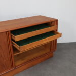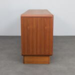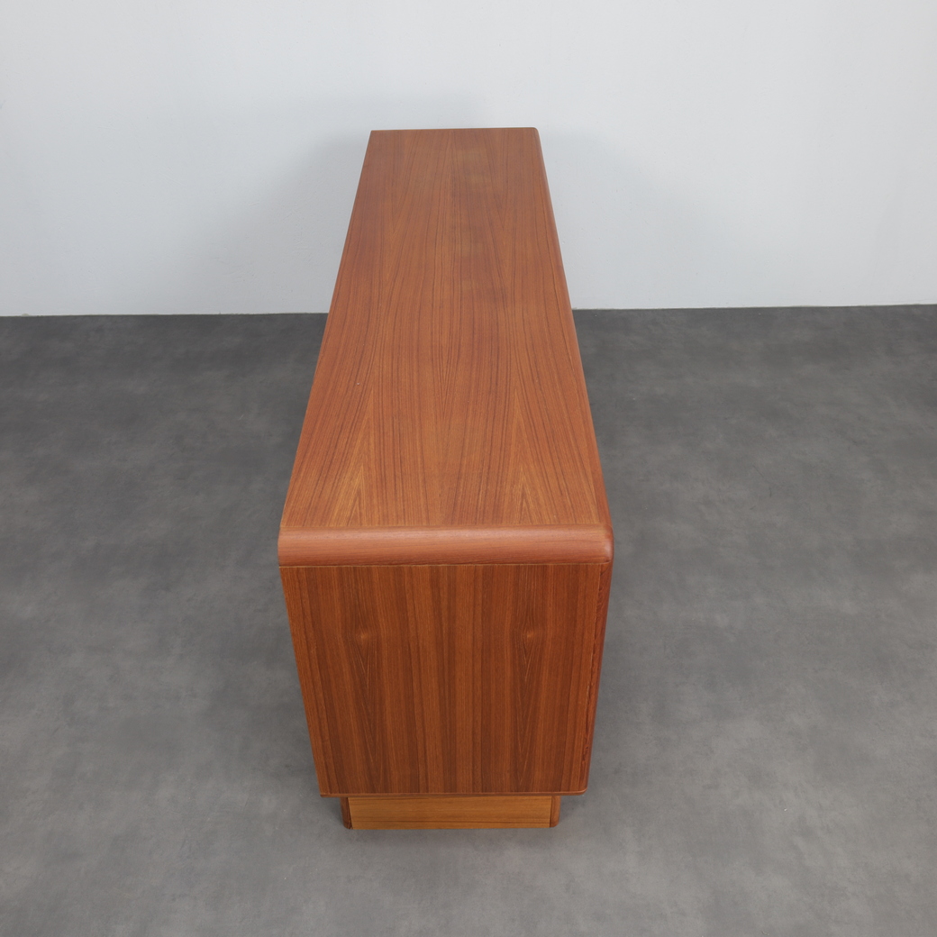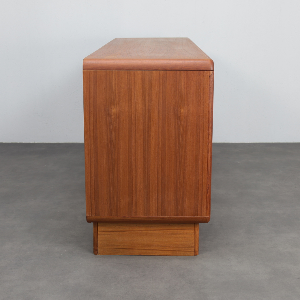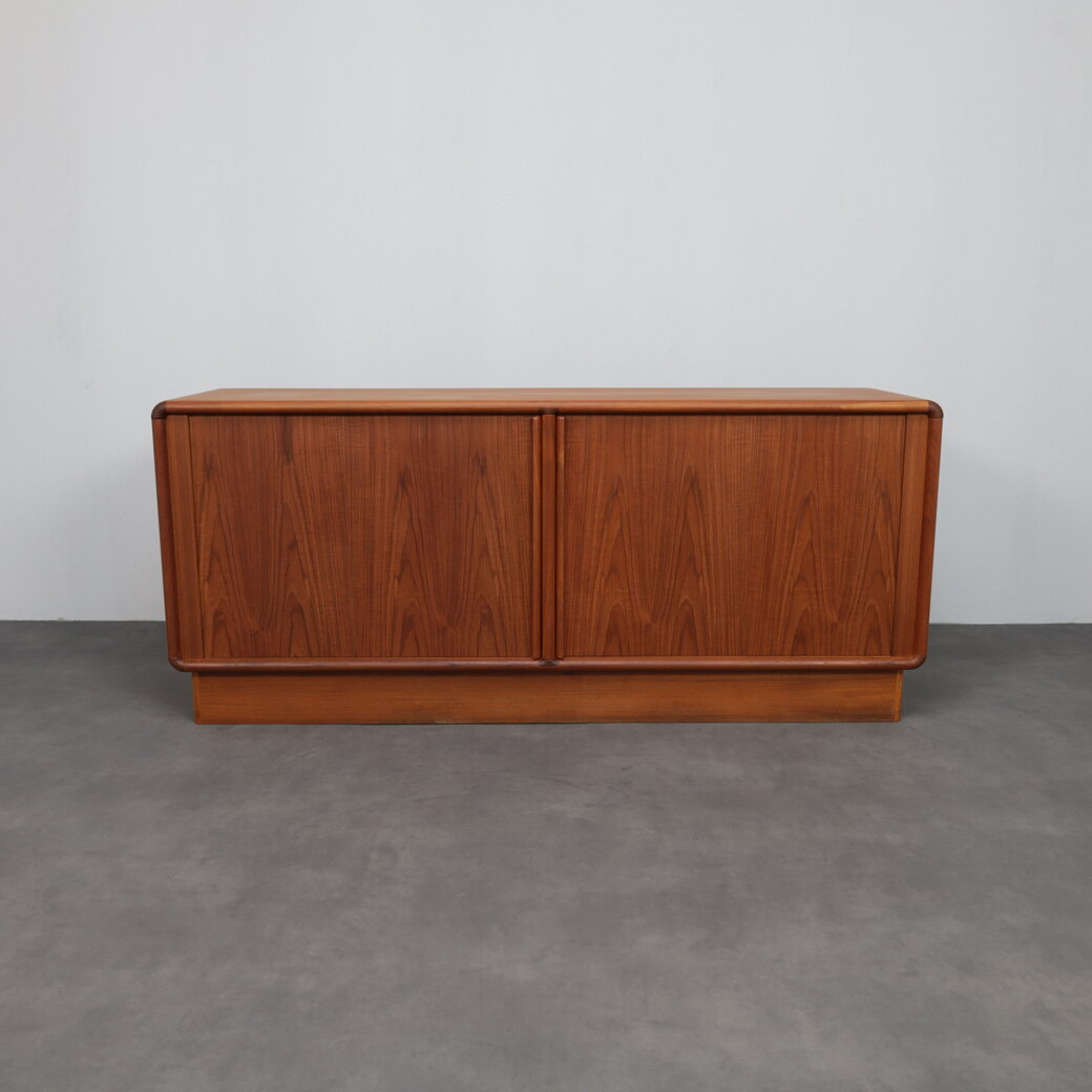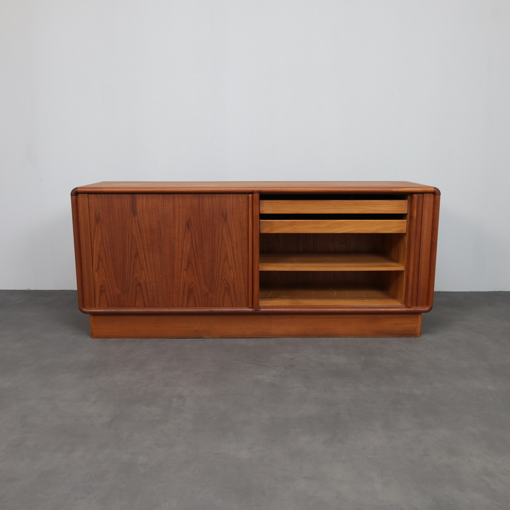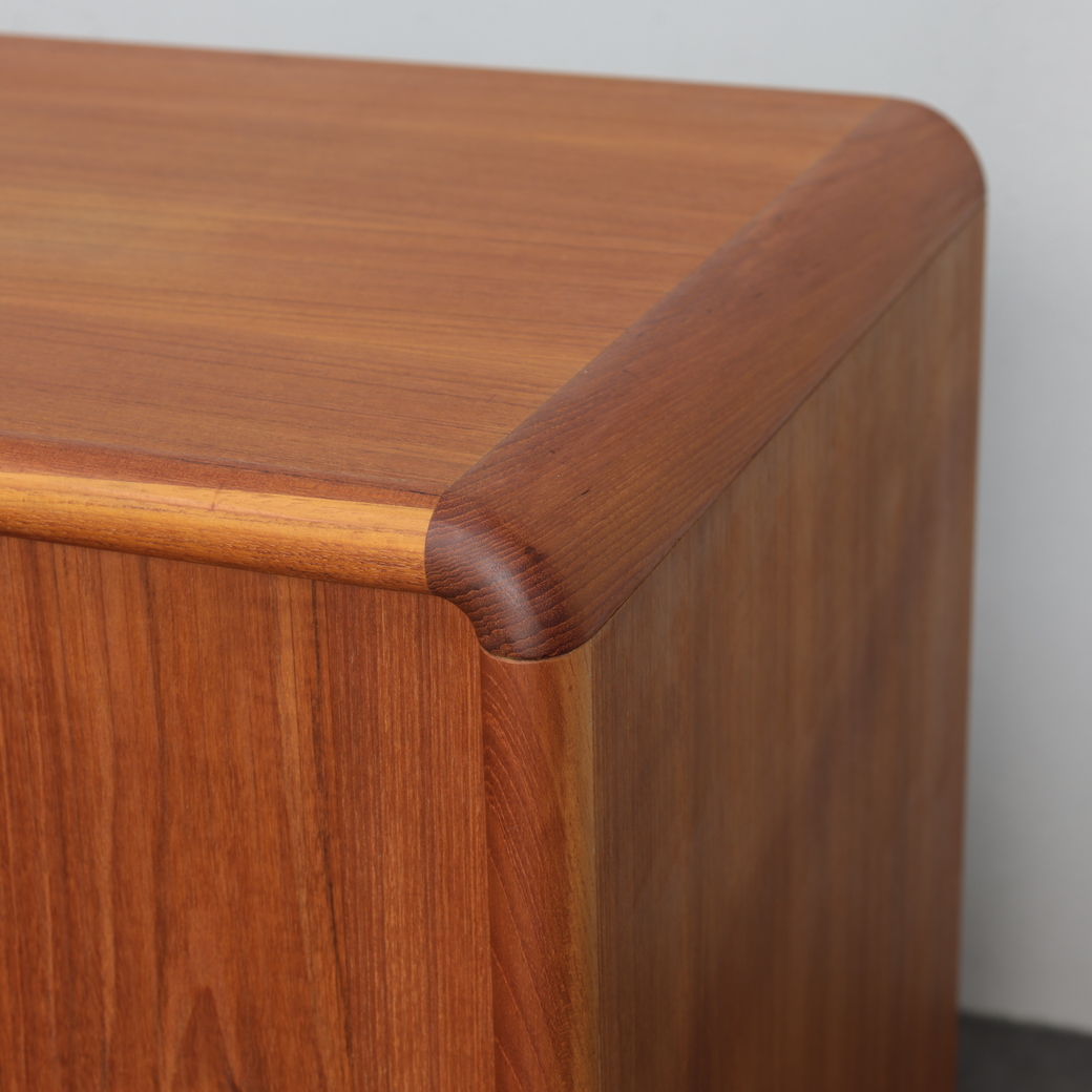 This elegant Danish modern sideboard by Kibaek Møbelfabrik exemplifies the quiet sophistication and functional clarity that define Scandinavian furniture of the 1970s. Crafted in richly grained teak, the piece is distinguished by its beautifully executed tambour doors, which slide smoothly to reveal ample storage while maintaining a clean, uninterrupted exterior.