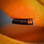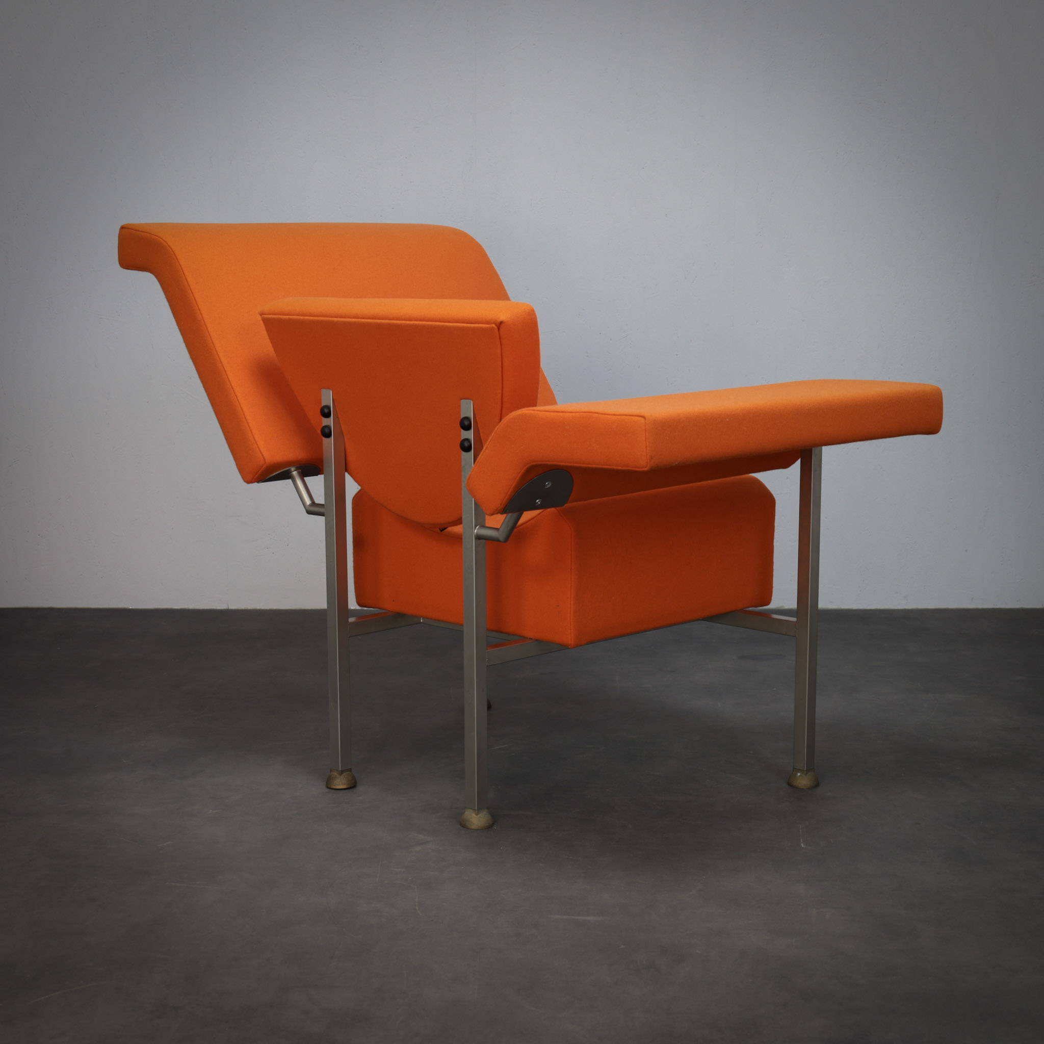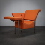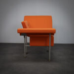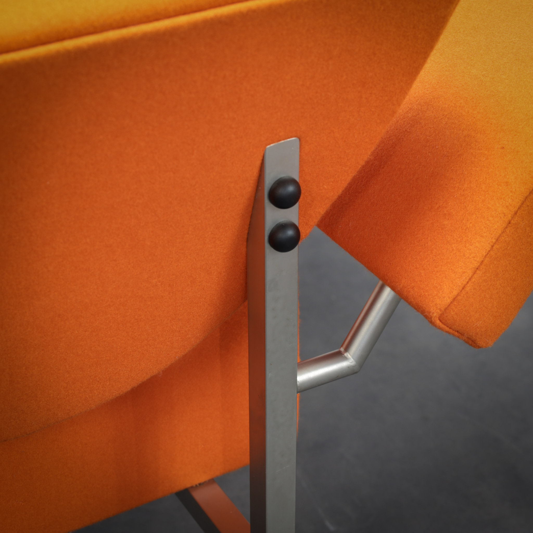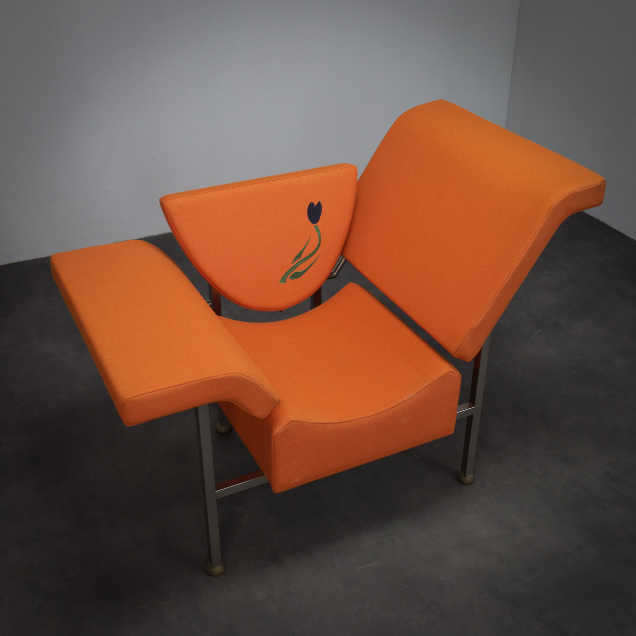 Its vivid orange upholstery enhances the chair’s presence, reinforcing its connection to national symbolism while emphasizing its bold, postmodern character. The contrast between the soft textile surfaces and the clean stainless steel frame creates a refined tension between comfort and structure.
