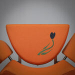 The chair is defined by its unconventional composition: angular armrests, a sculptural seat and a graphic backrest featuring a stylized tulip motif — a subtle yet unmistakable reference to Dutch culture. The composition feels almost architectural, balancing asymmetry with a strong visual rhythm.