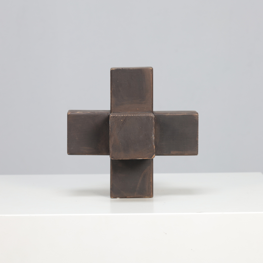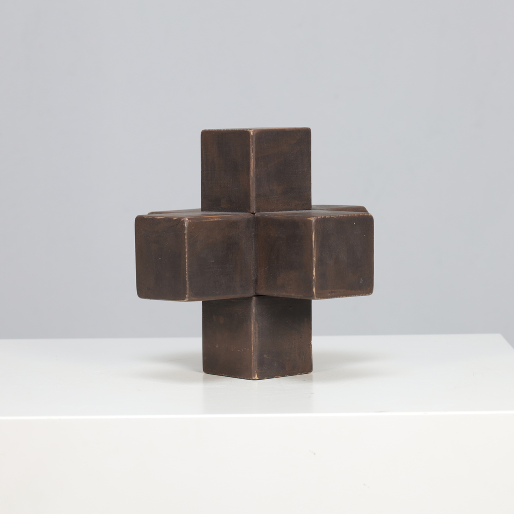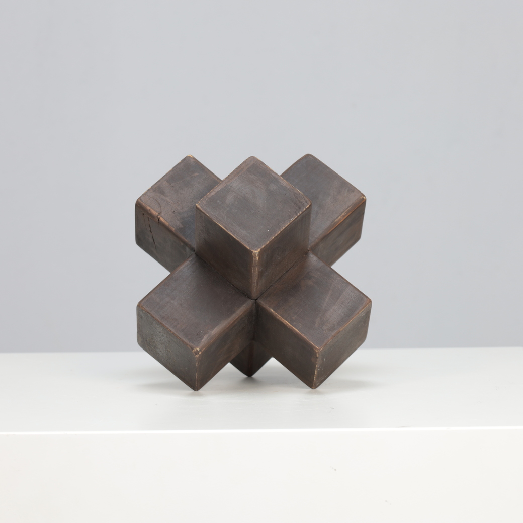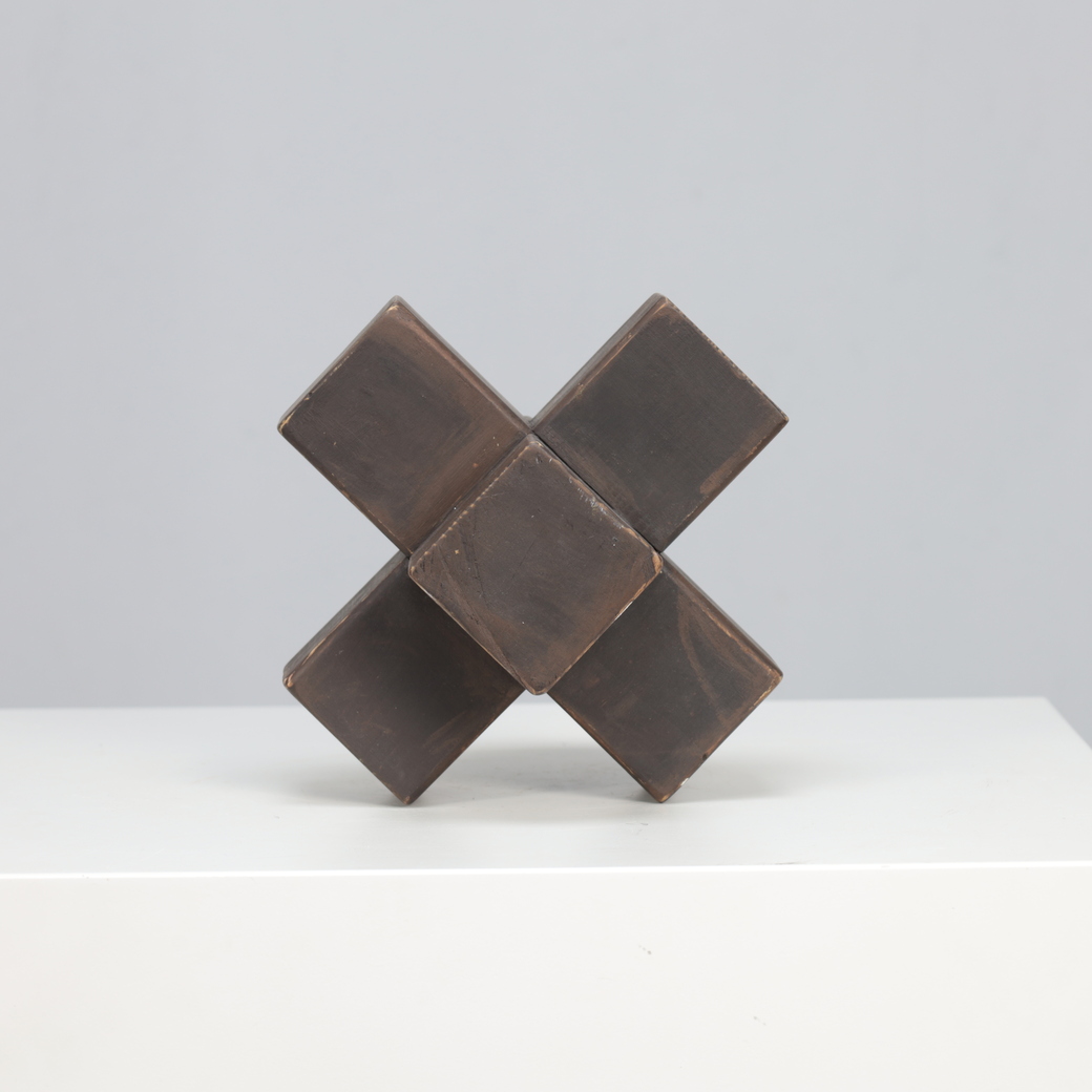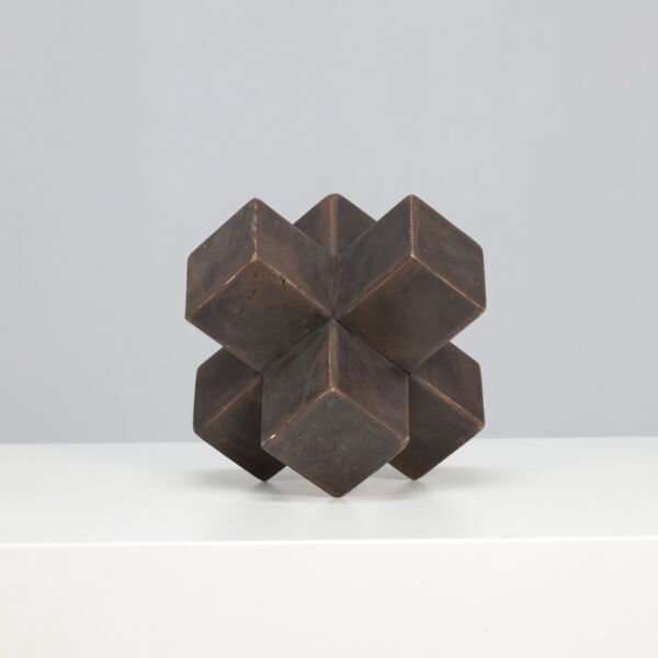 The intersecting cubic volumes seem to balance tension and symmetry, reflecting both architectural discipline and spiritual abstraction. Its handcrafted surfaces, subtly patinated by time, evoke the meditative objecthood of Minimal and Concrete Art movements that flourished in postwar Europe.