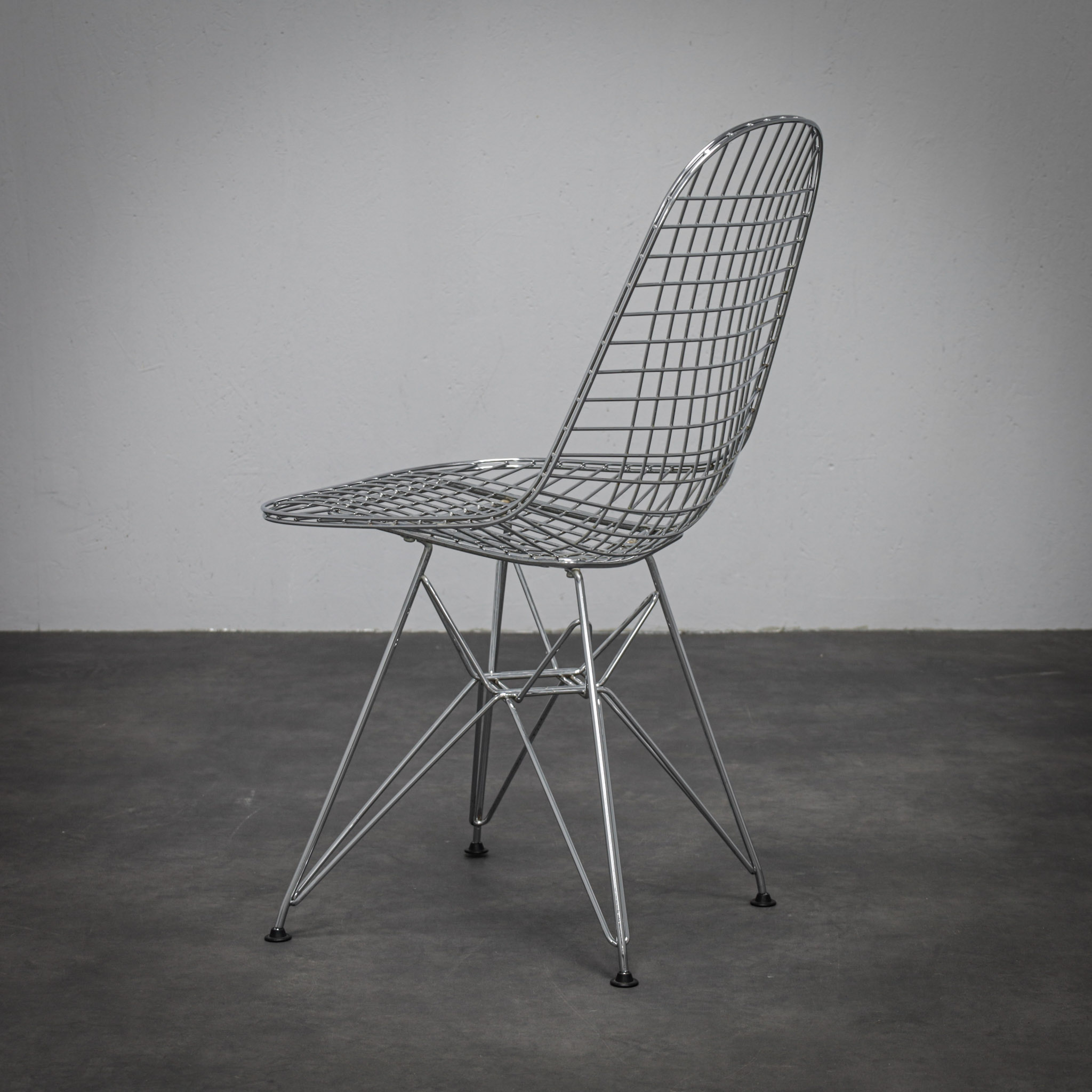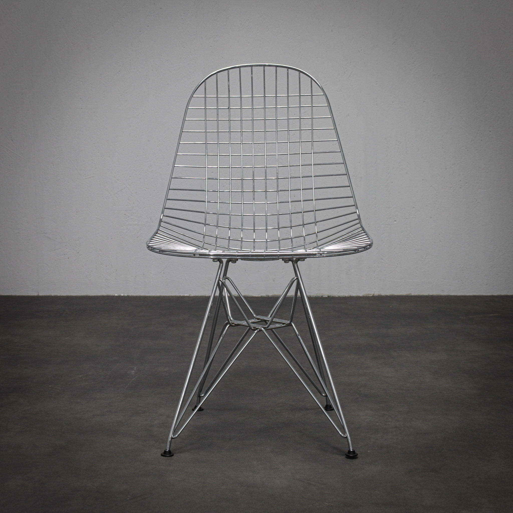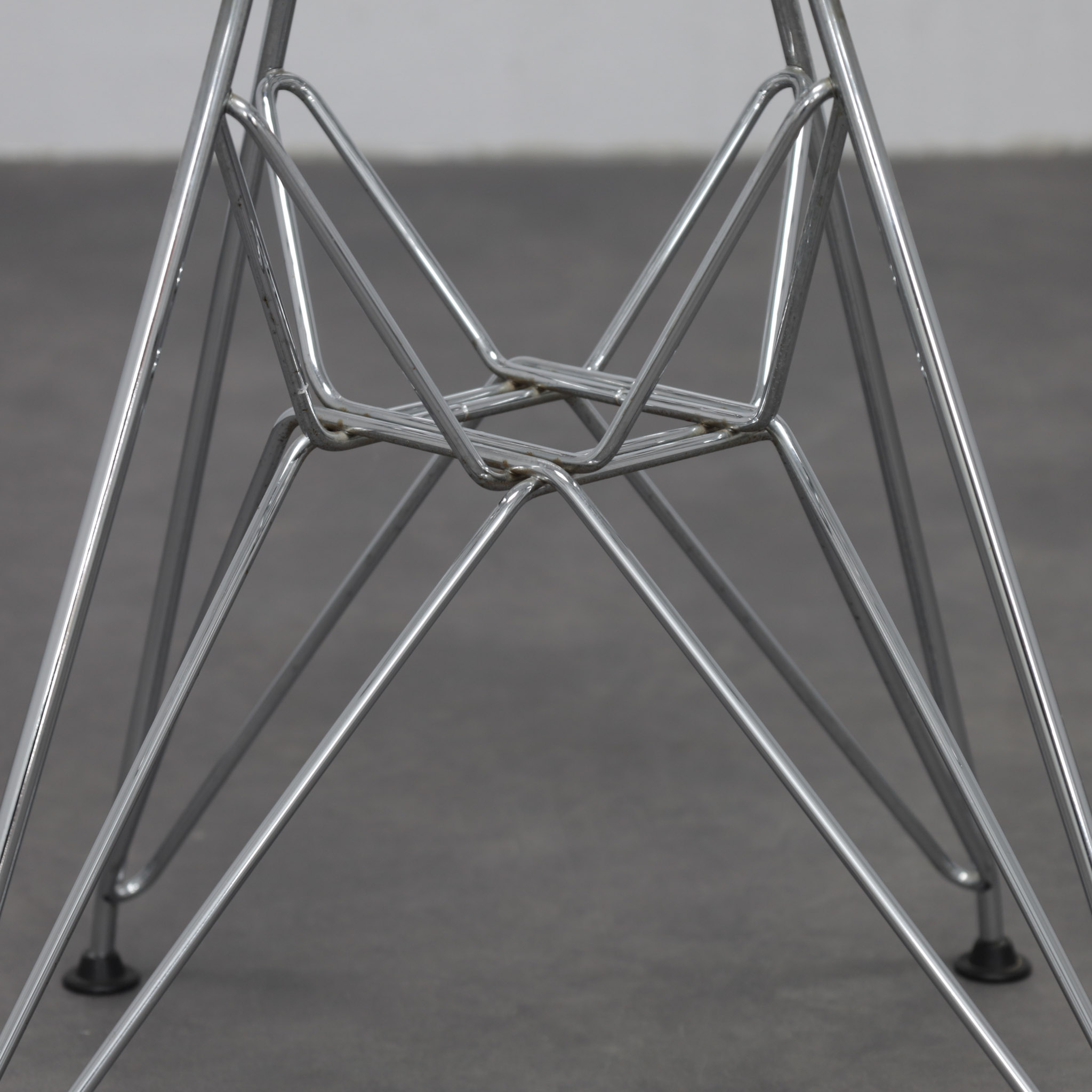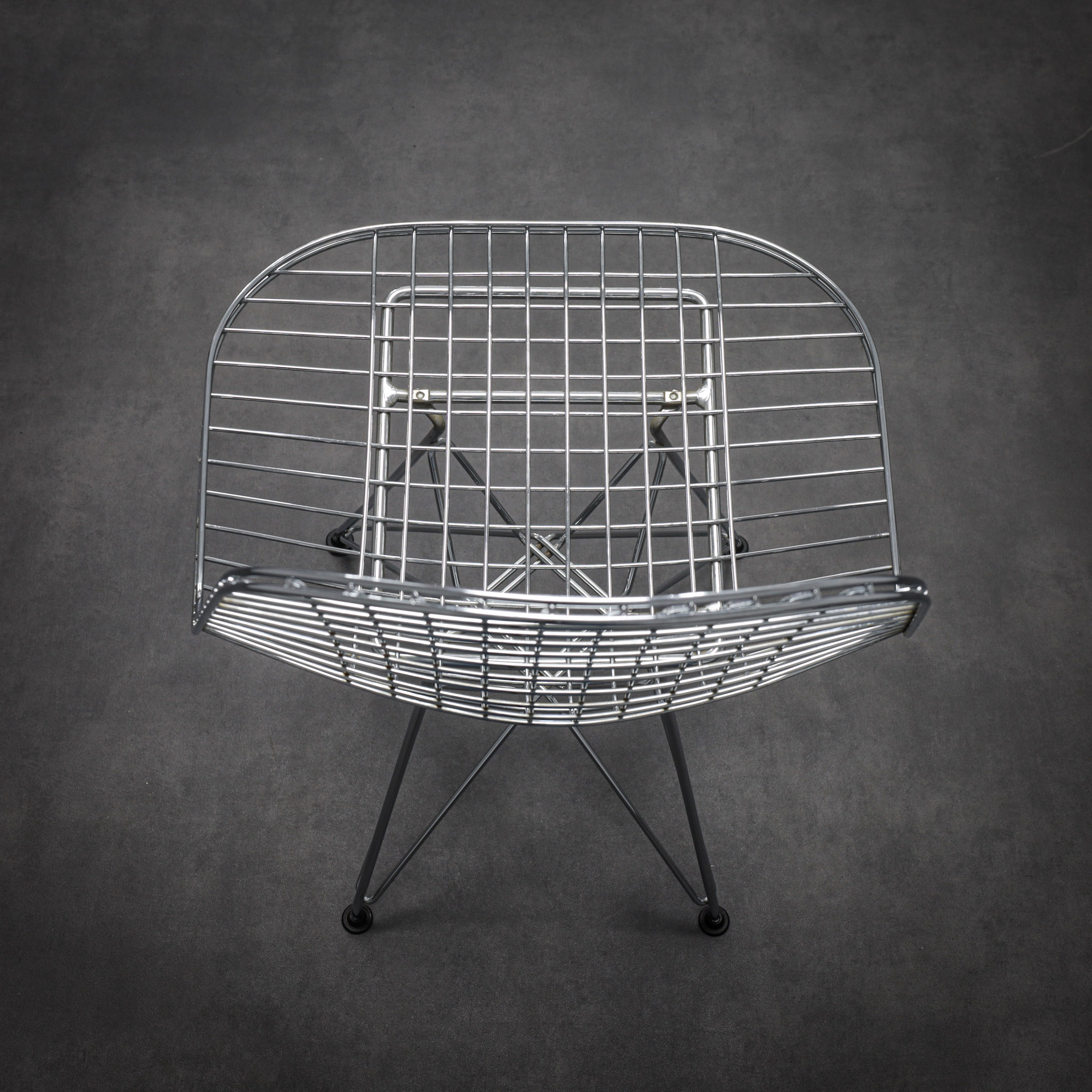 The chromed steel frame defines both seat and back in a continuous lattice, creating a light, almost immaterial presence. The geometric grid interacts with the architectural Eiffel base, balancing visual delicacy with structural stability. Rather than mass, the design relies on line and rhythm — a hallmark of mid-century modern innovation.