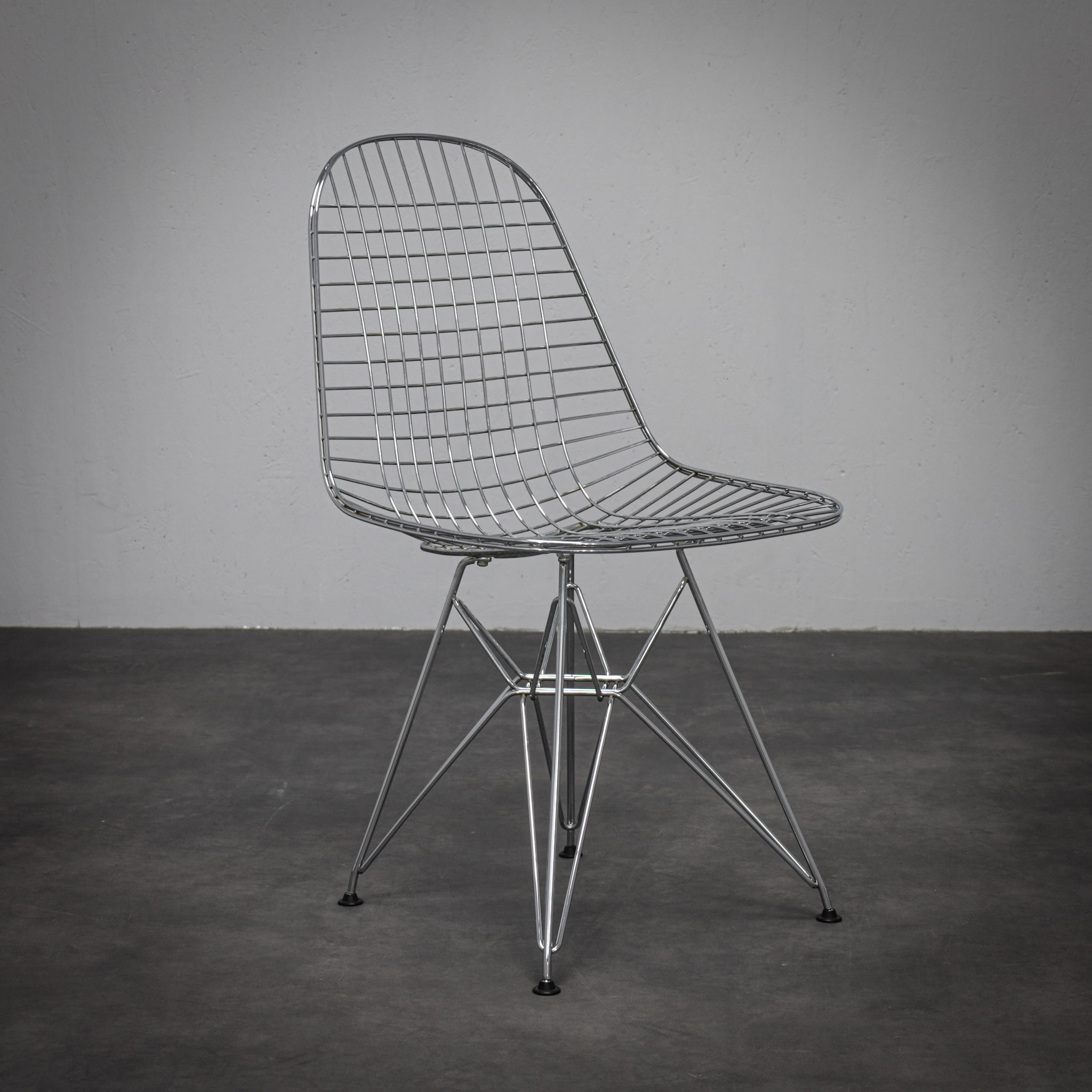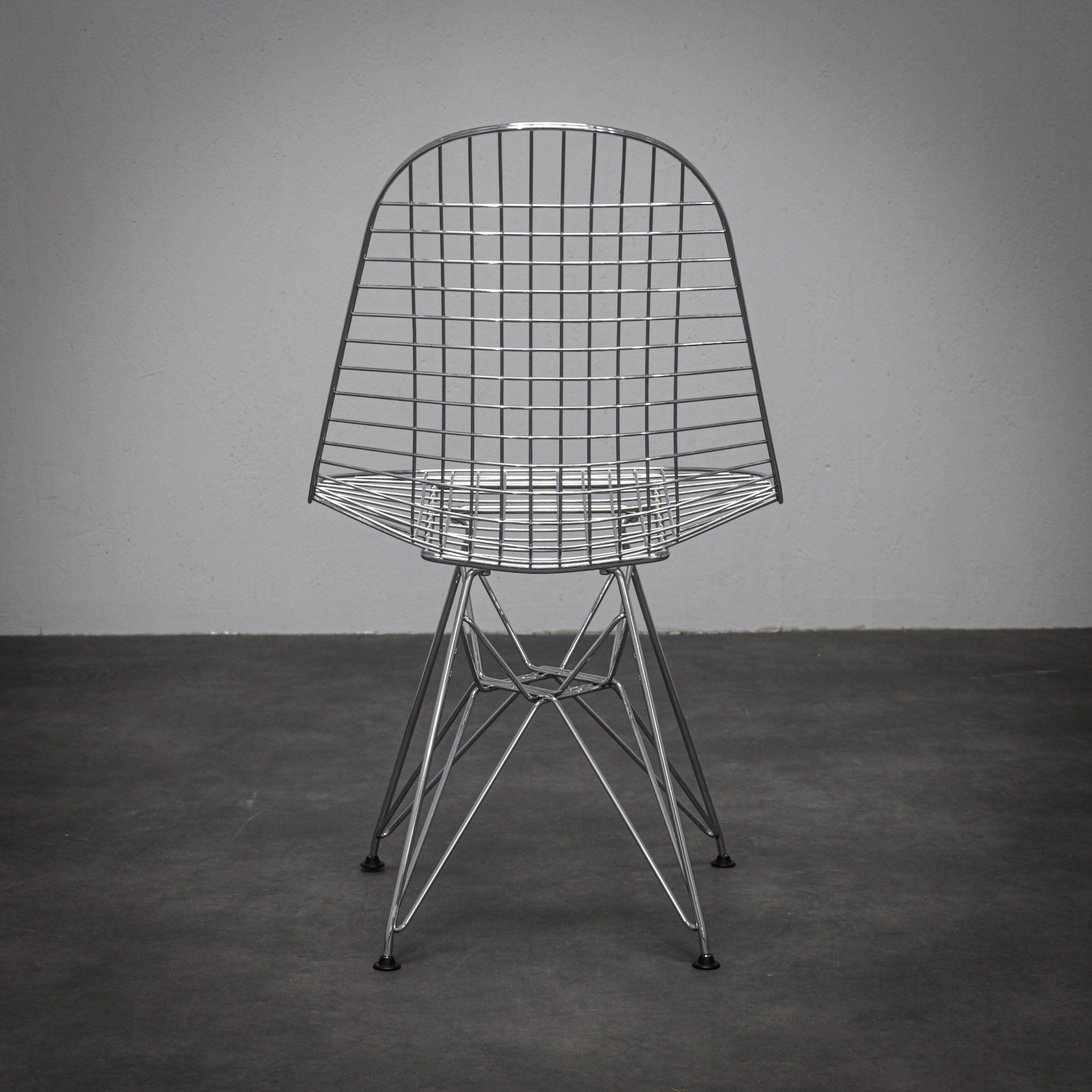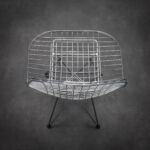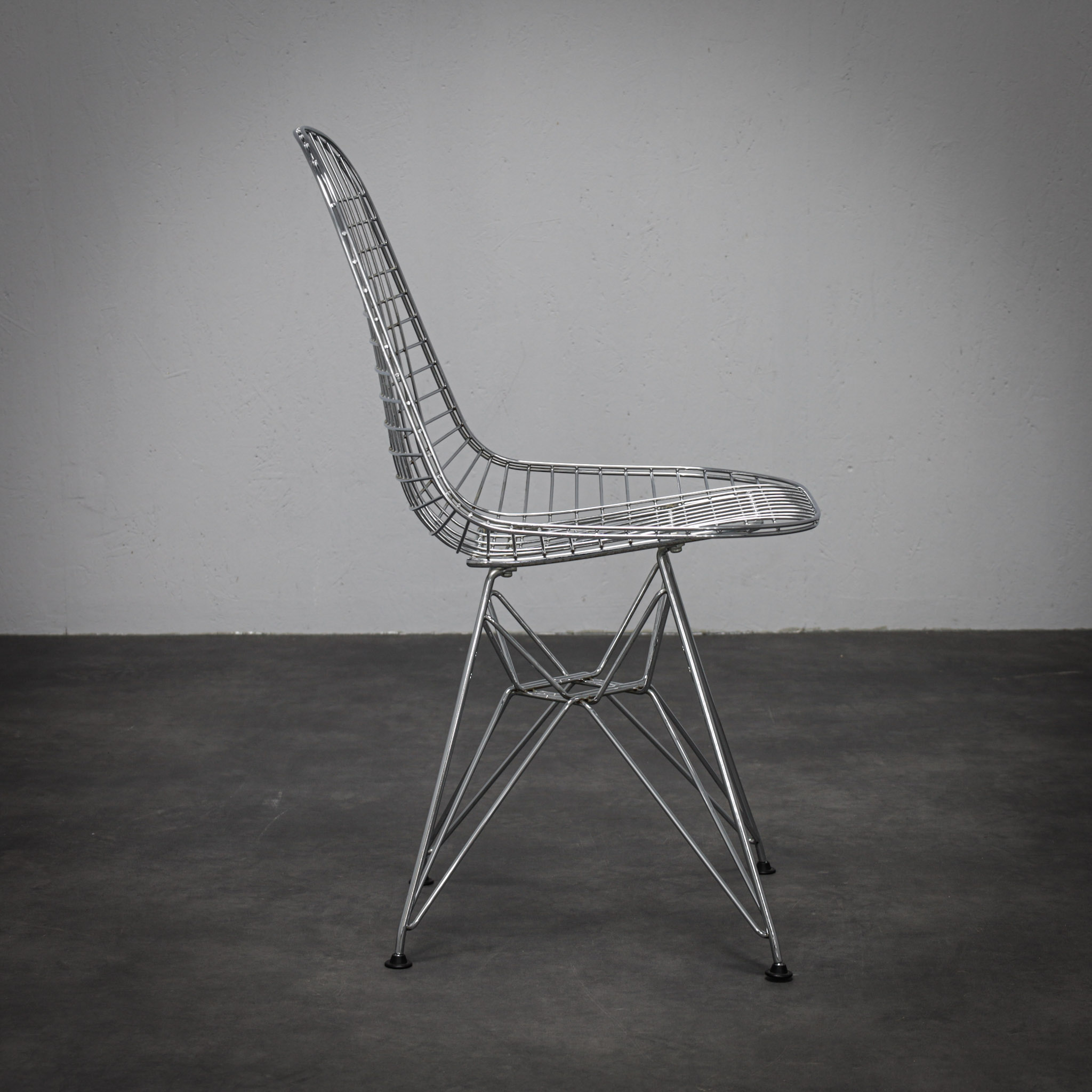 The chromed steel frame defines both seat and back in a continuous lattice, creating a light, almost immaterial presence. The geometric grid interacts with the architectural Eiffel base, balancing visual delicacy with structural stability. Rather than mass, the design relies on line and rhythm — a hallmark of mid-century modern innovation.