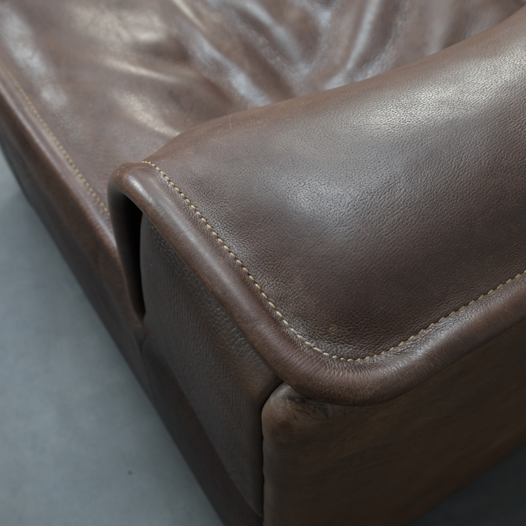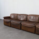The DS-12 is defined by its low, generous profile and rhythmic modular composition. Each element is softly contoured, creating a continuous visual flow while retaining a strong architectural presence. Thick, supple leather envelops the sofa, revealing natural creases and subtle tonal variations that speak to authenticity, age, and material honesty. The deep seats and wide armrests invite relaxation, while the modular structure allows the sofa to function both as a sculptural interior landscape and as highly functional seating.