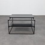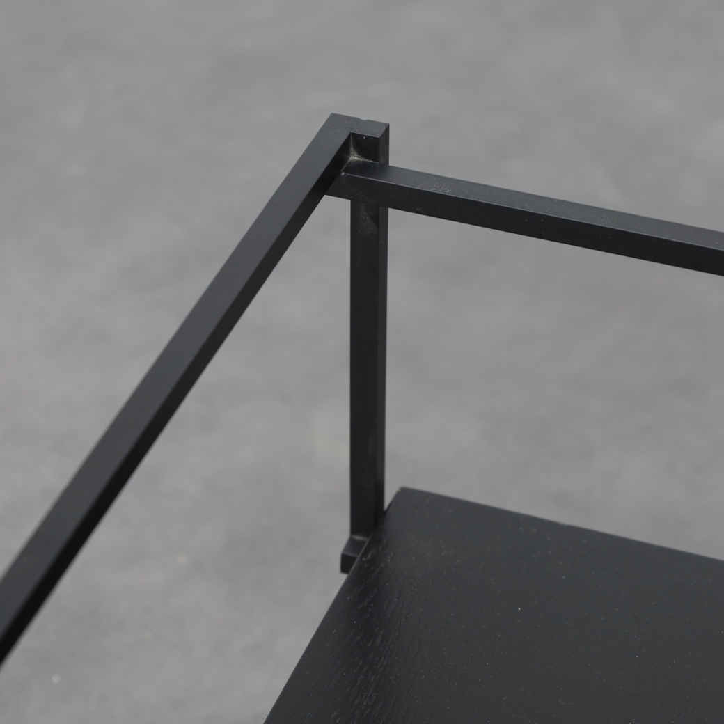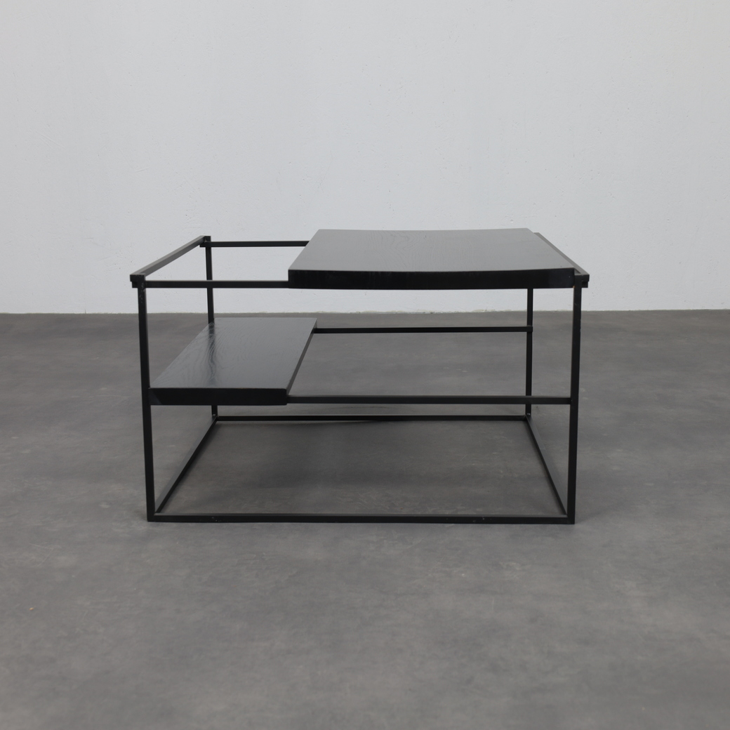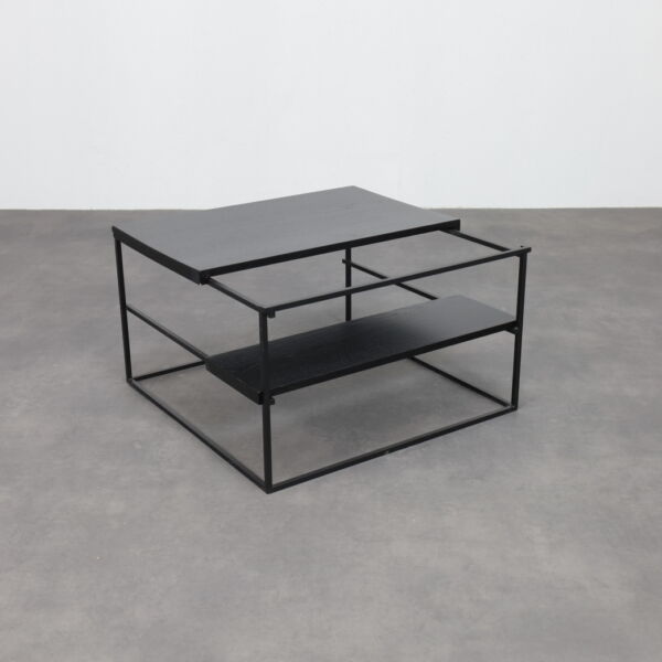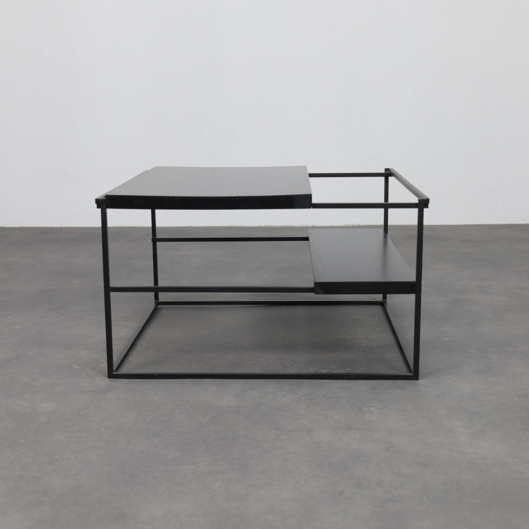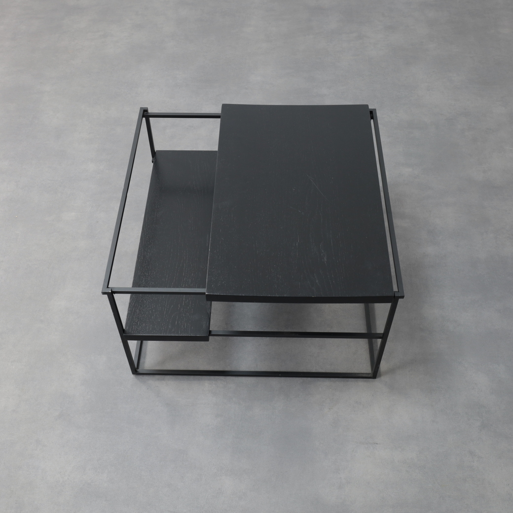 The table is defined by its graphic, architectural frame in black metal, paired with horizontal surfaces finished in oak veneer. The layered construction creates a subtle play of planes and depth, giving the table a light yet grounded presence. Clean lines and restrained detailing allow the materials to speak for themselves, while the open structure lends the design an almost floating quality. Both sculptural and practical, the Jukebox coffee table functions as a calm focal point within a modern interior.