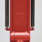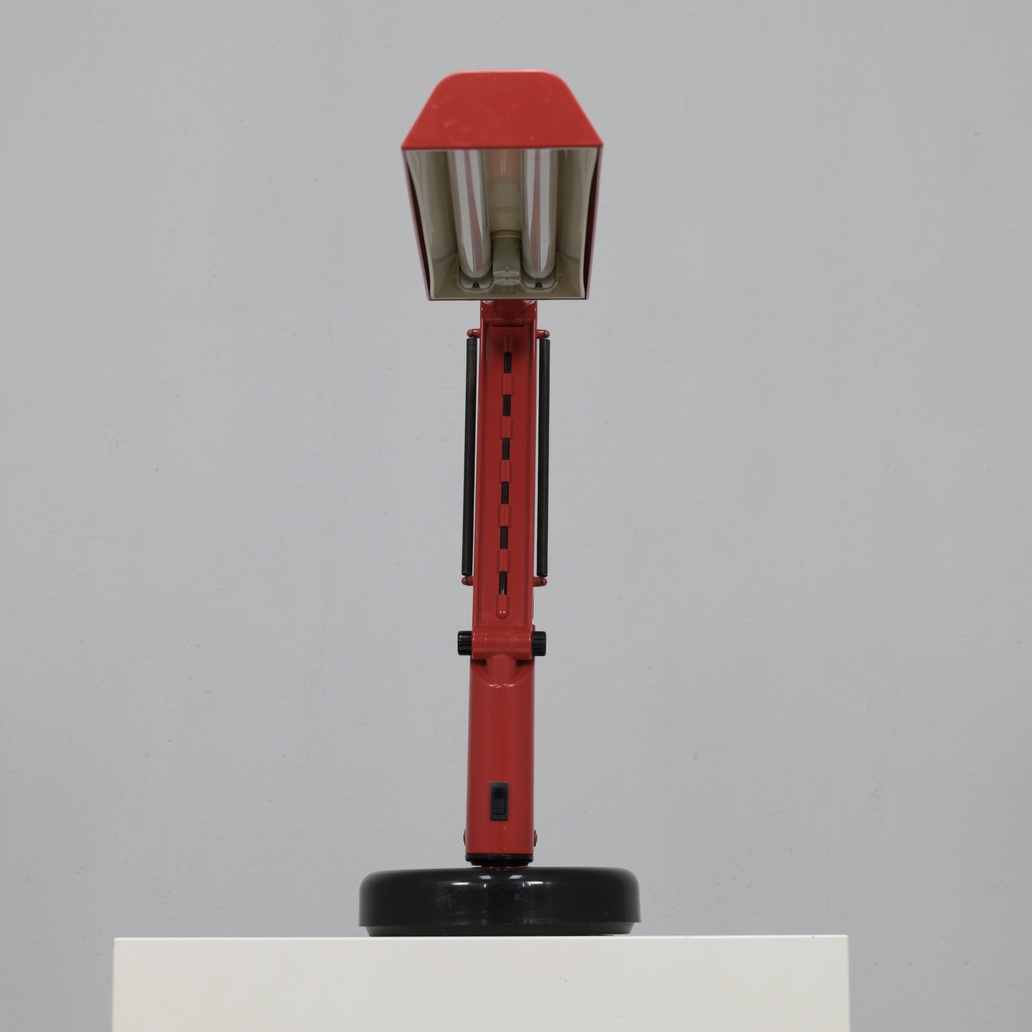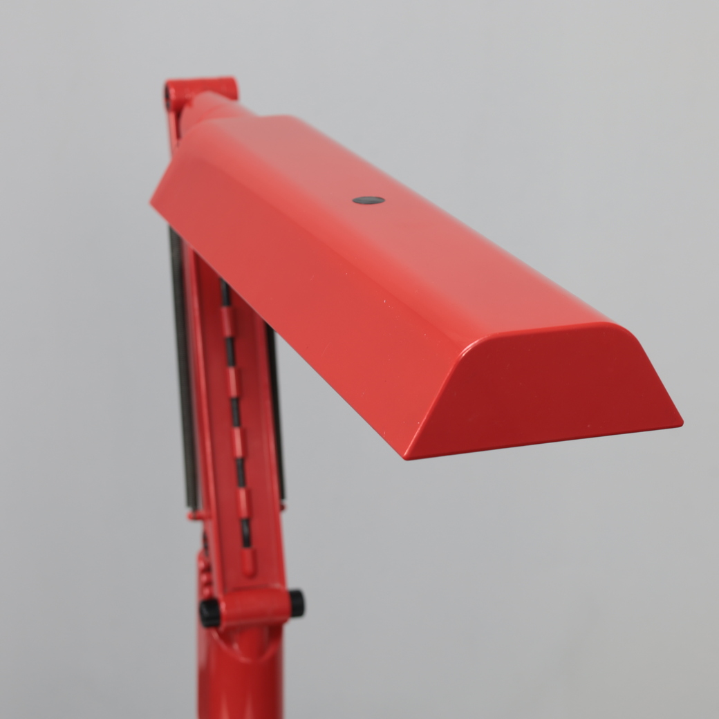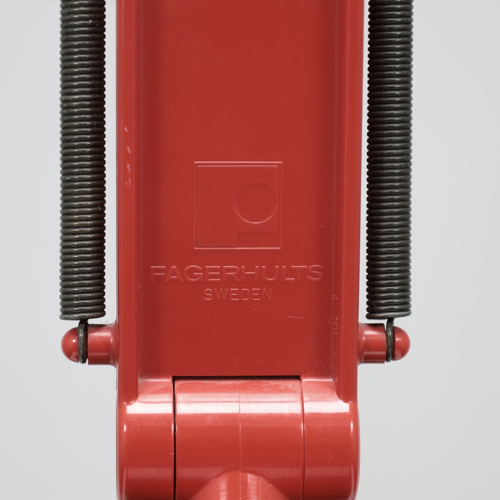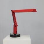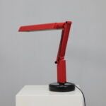 The “Lucifer” table lamp, designed by Tom Ahlström and Hans Ehrich for Fagerhults, represents the bold yet rational Scandinavian design ethos of the 1970s. Constructed in lacquered metal with an articulated arm and pivoting shade, the lamp combines technical precision with playful expression. The vivid red finish contrasts elegantly with its black circular base, creating a functional object that also reads as a sculptural composition.