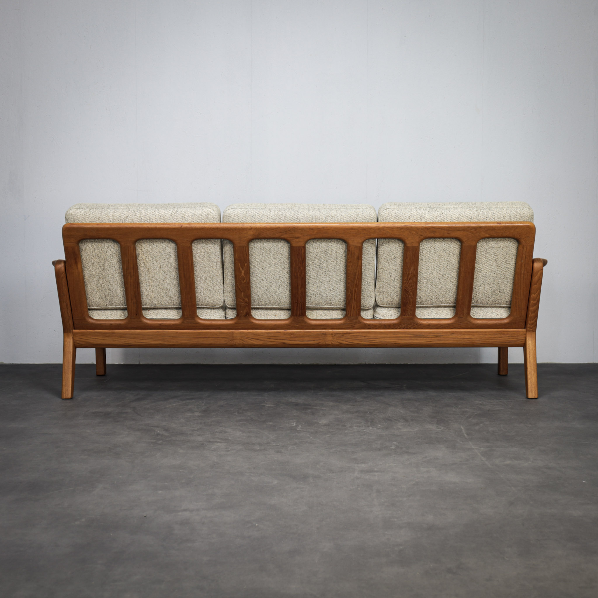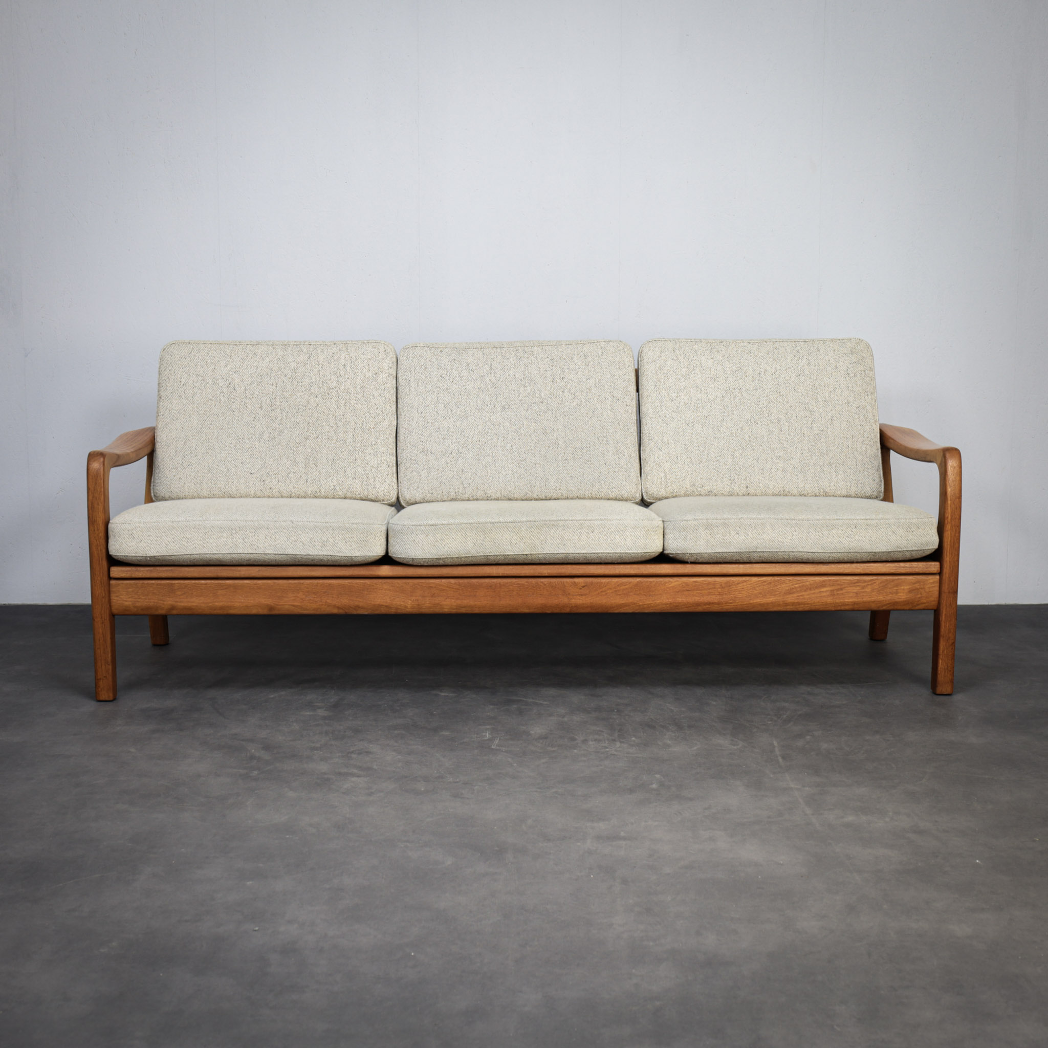The solid teak frame gives the sofa a warm, natural look, while the soft wool cushions provide comfort and a calm, neutral feel. The open armrests and balanced proportions make it feel light and easy in a space.