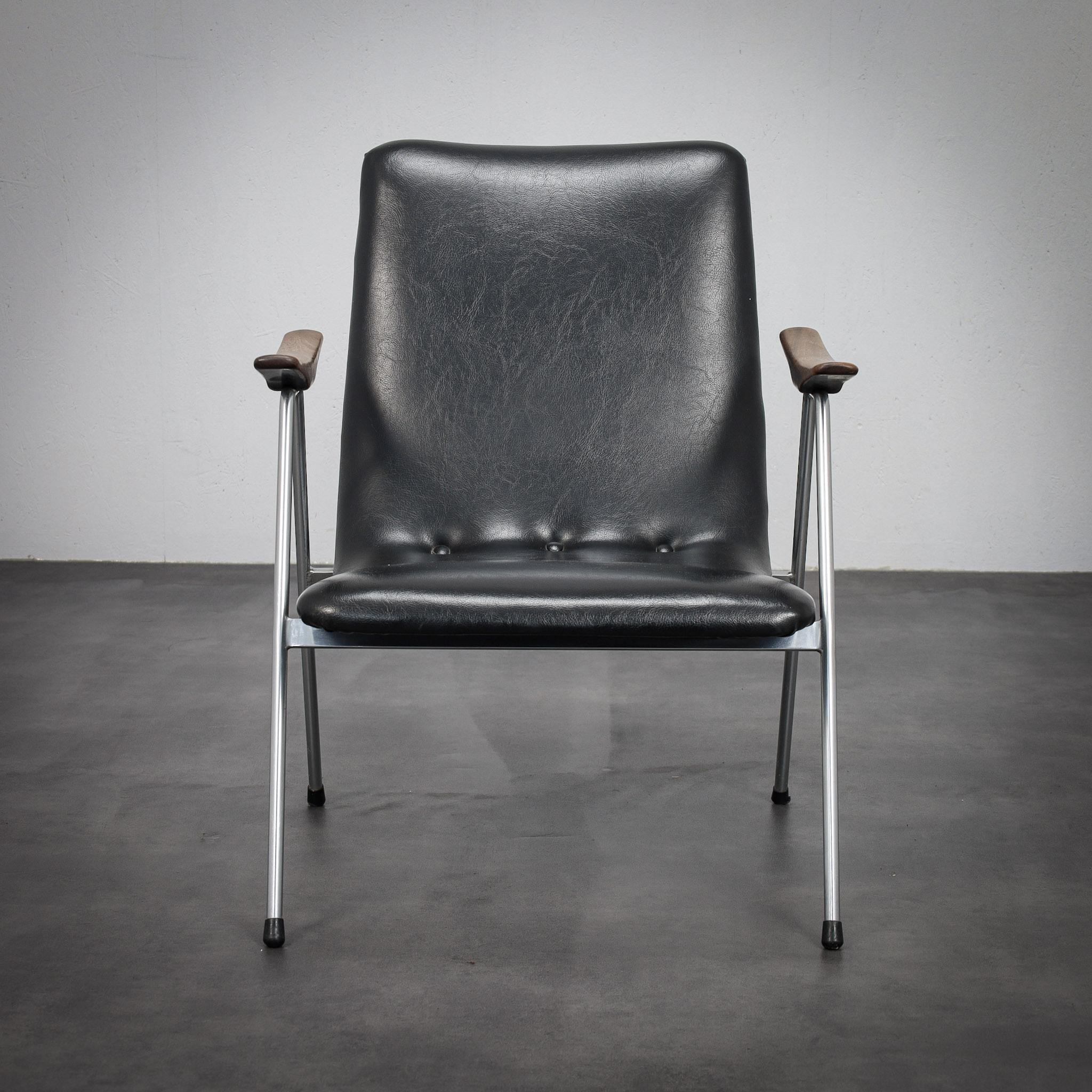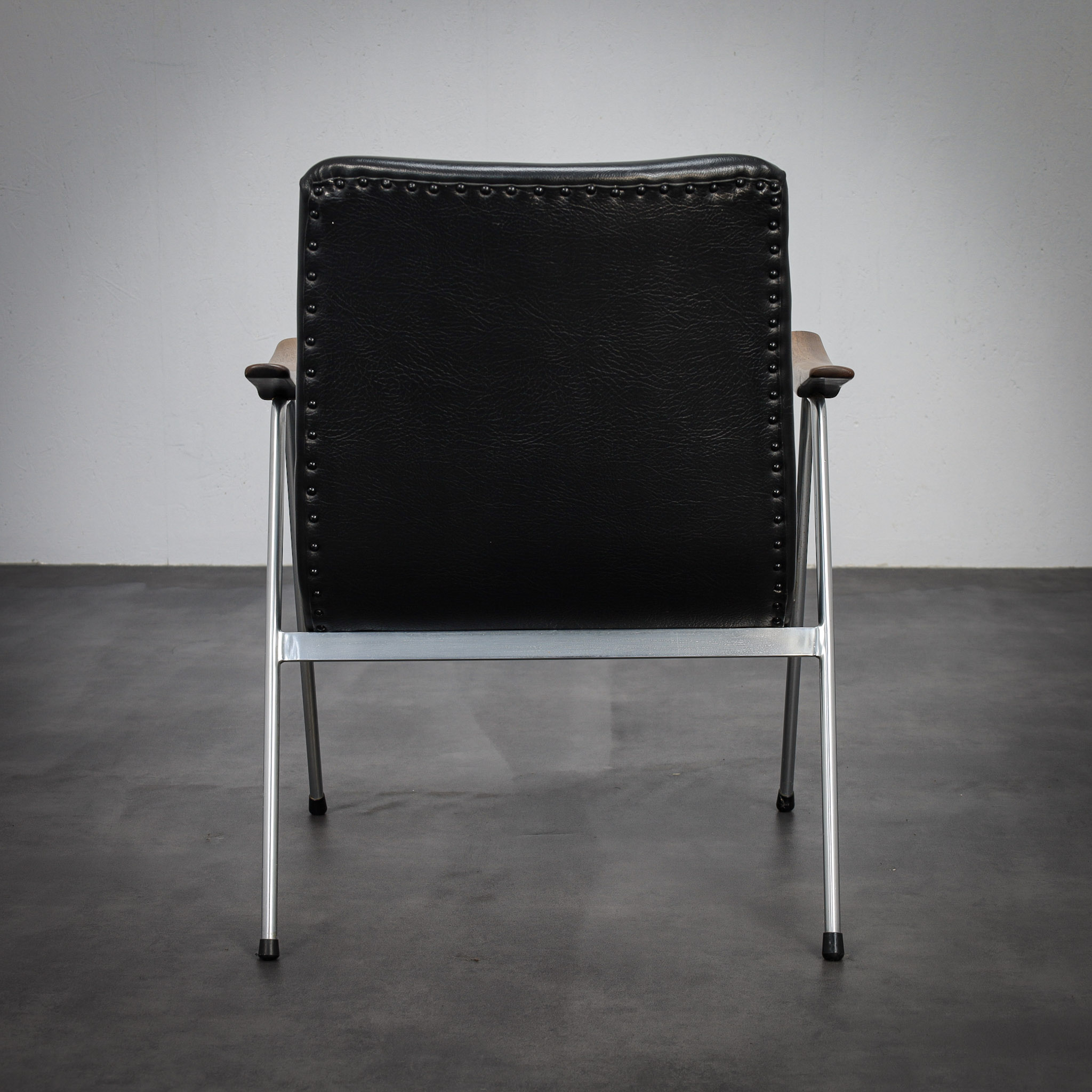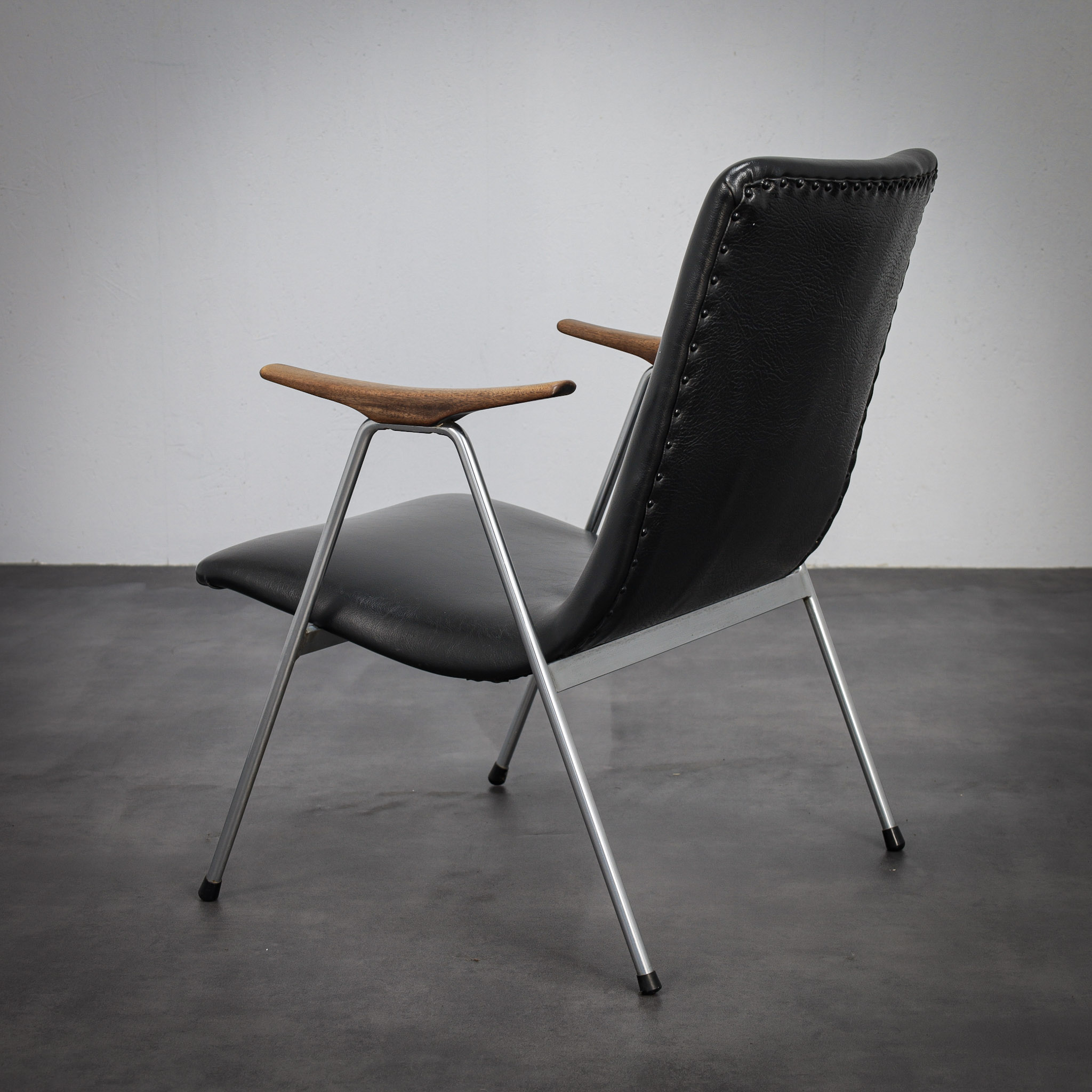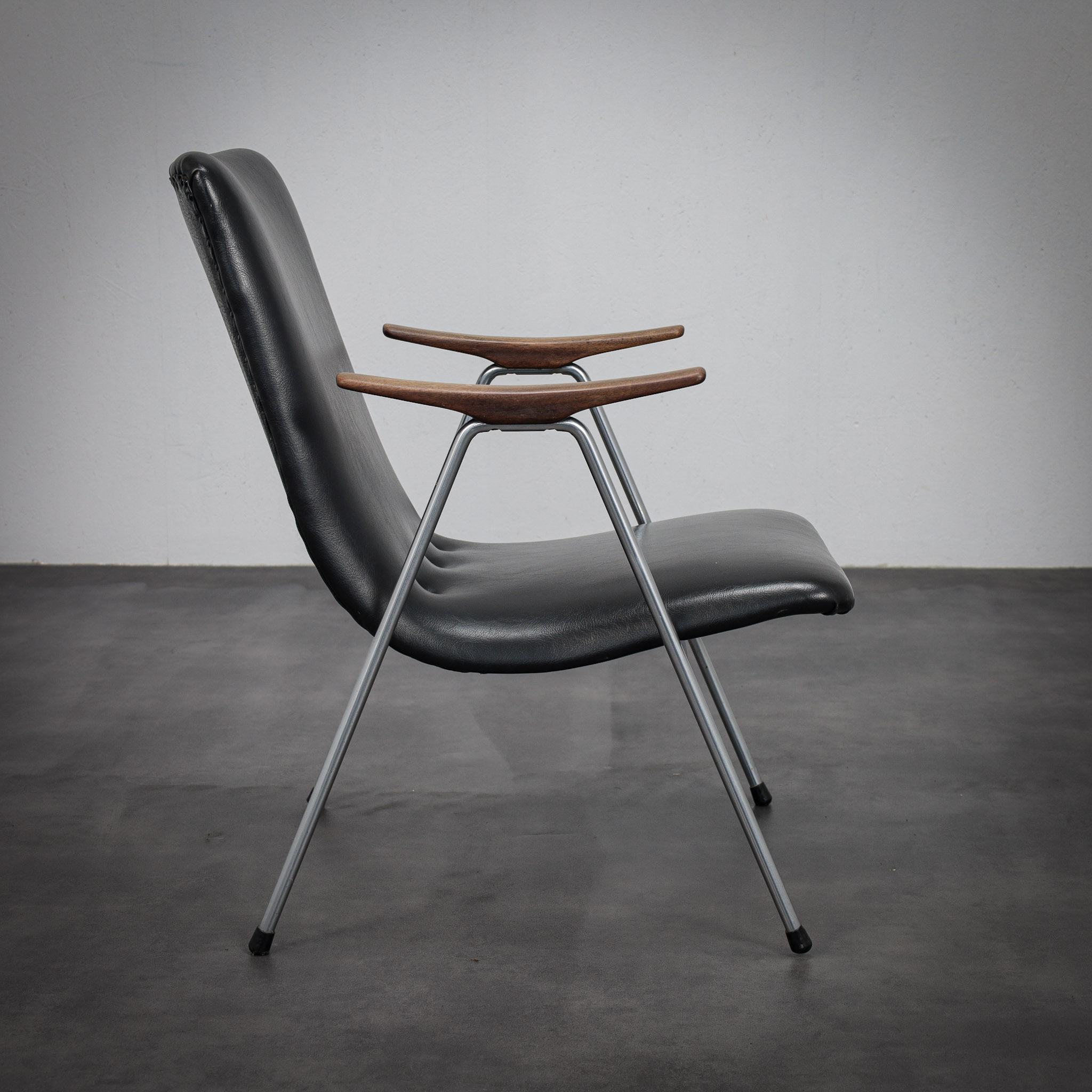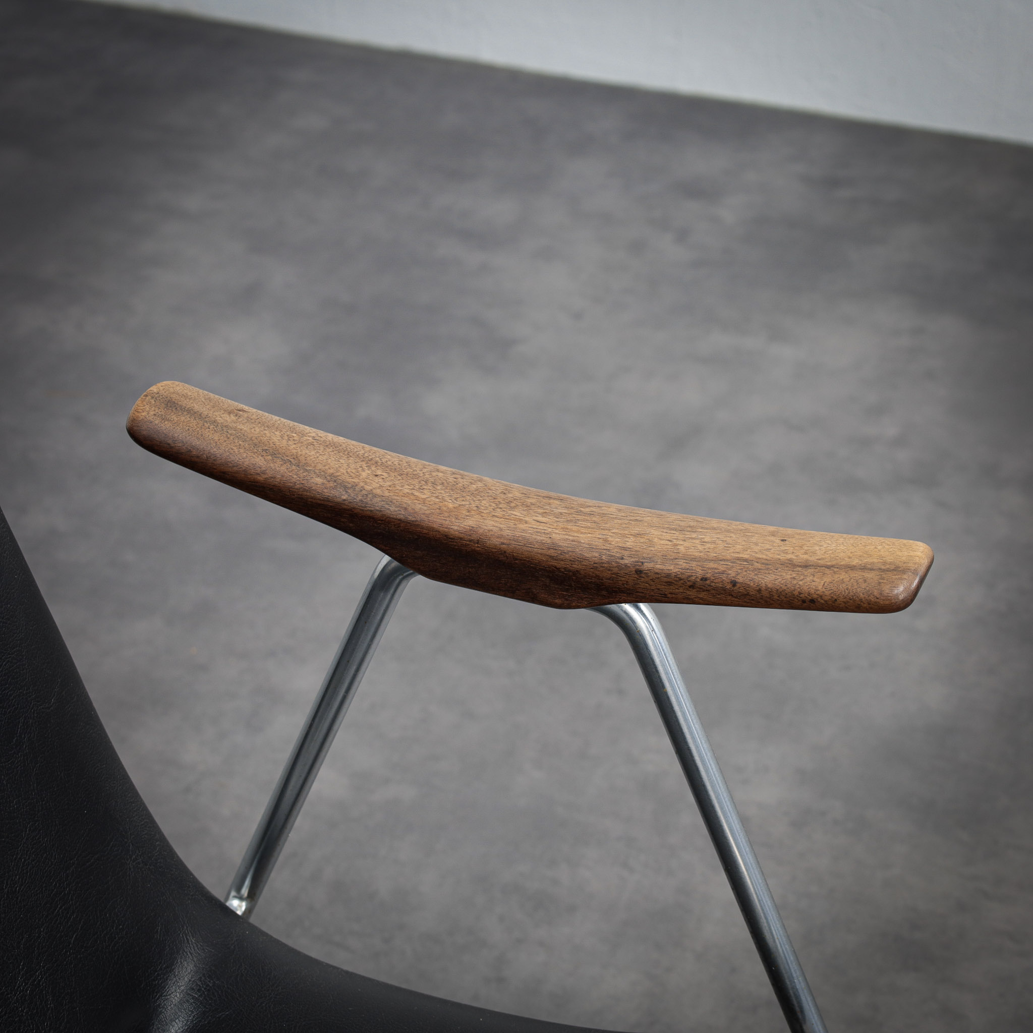 The gently reclined silhouette offers both comfort and visual restraint, while the sculpted wooden armrests introduce a subtle organic contrast to the clean, architectural lines of the stainless steel frame. The upholstery, executed in black leatherette, enhances the chair’s understated, modern character.