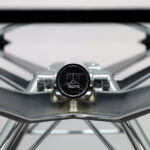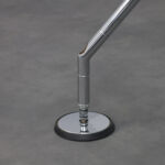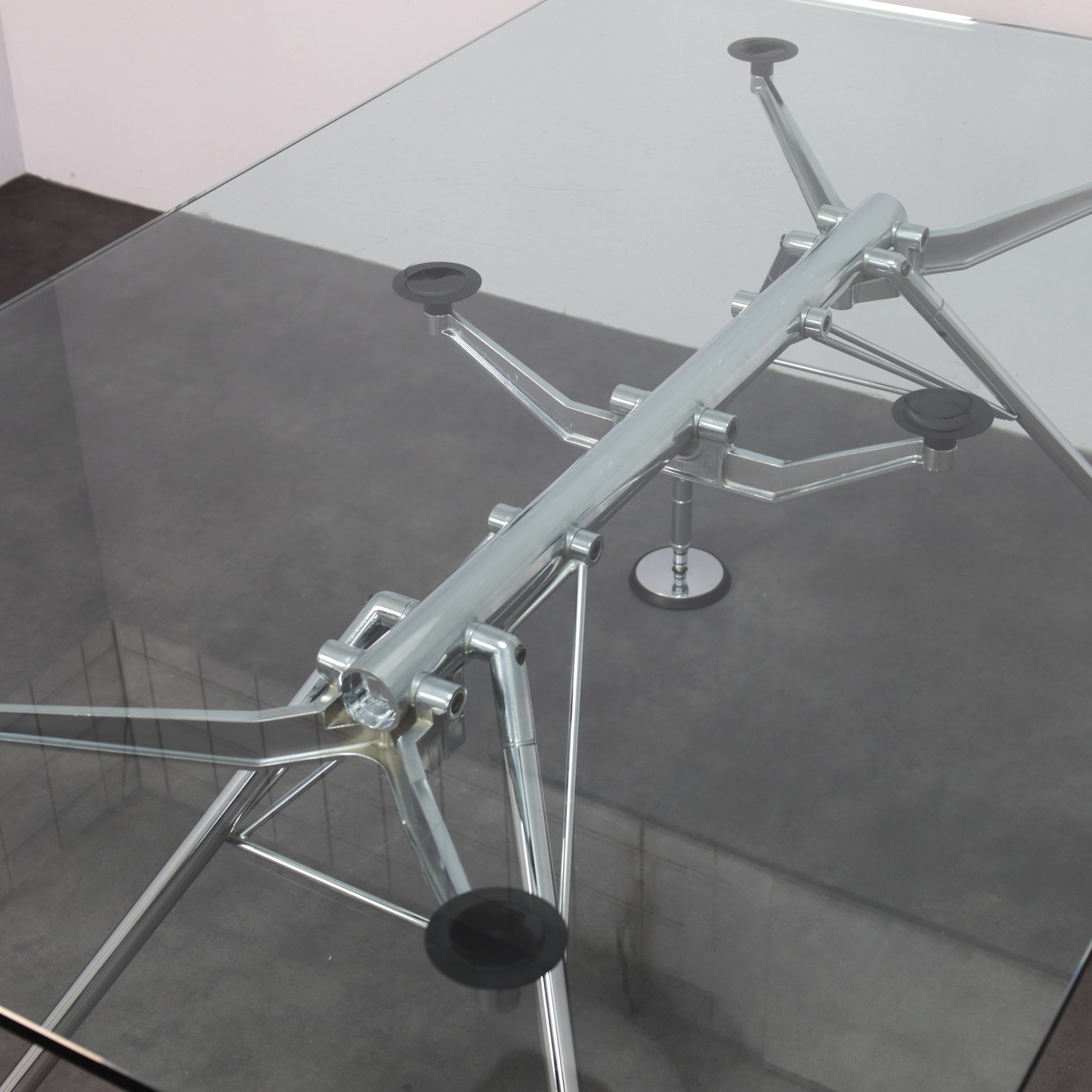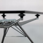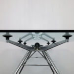 Slender aluminium legs are connected through articulated joints, creating a tensioned structure that distributes weight with visual lightness. The transparent glass top allows the construction to remain fully visible, turning engineering into aesthetic expression. The composition reflects Foster’s architectural language rational, high-tech and meticulously resolved.
