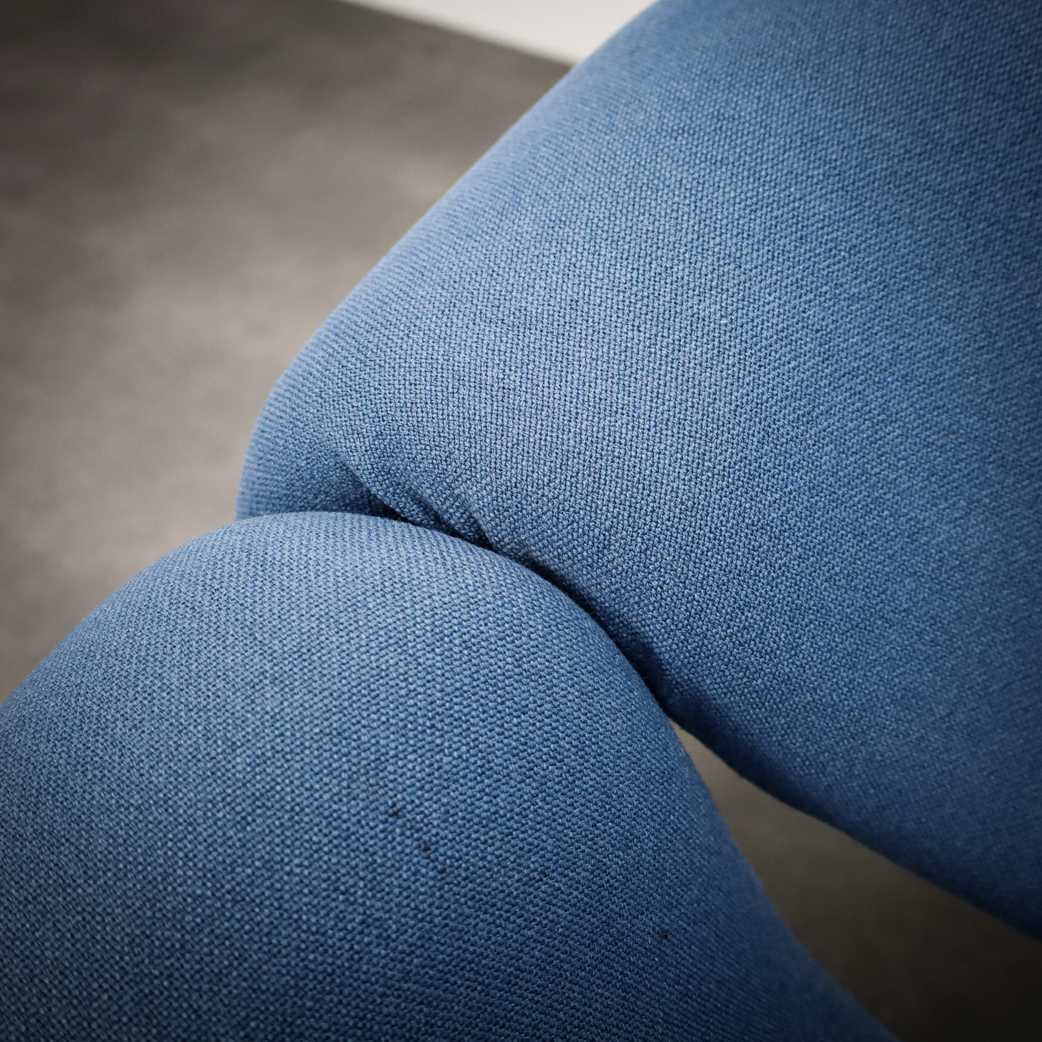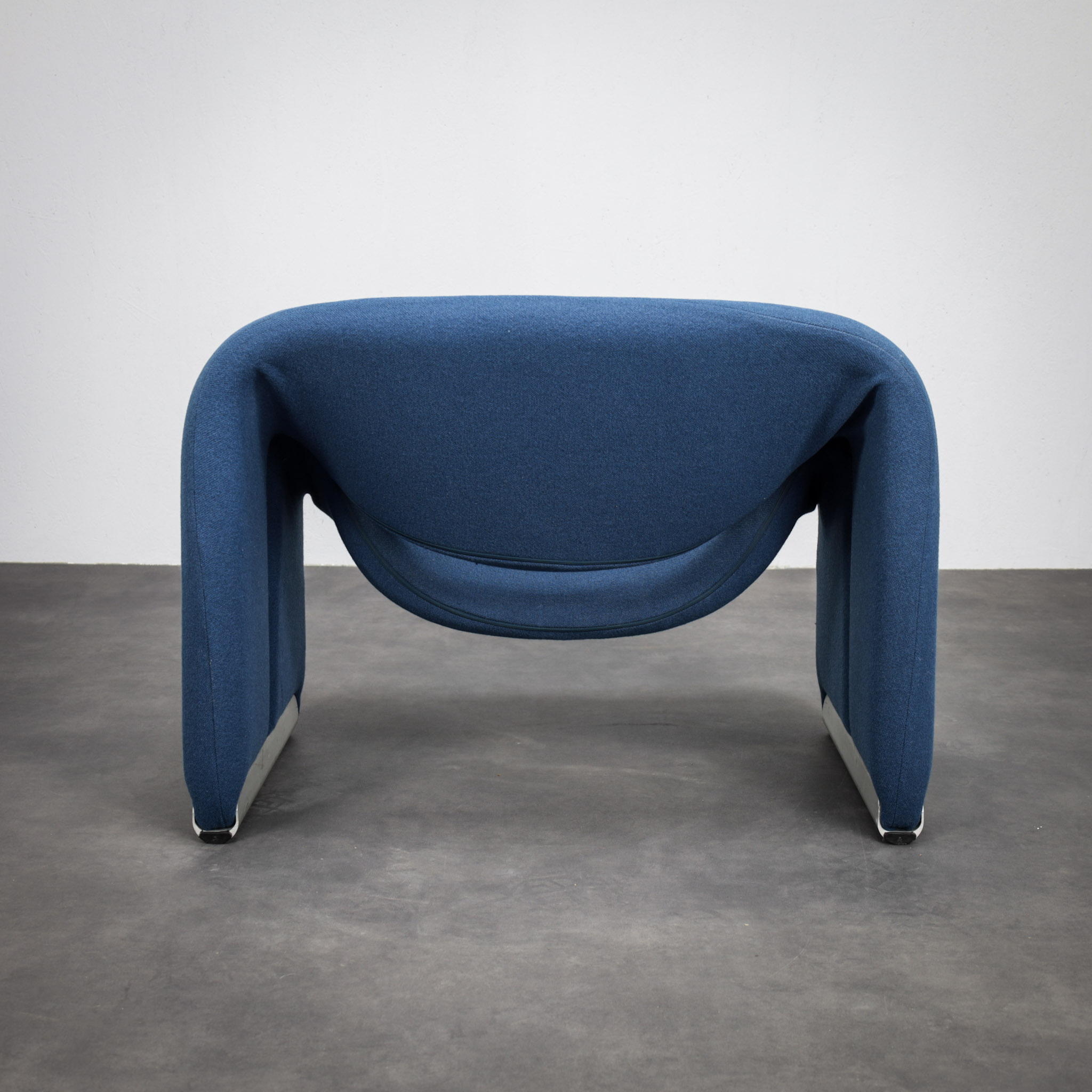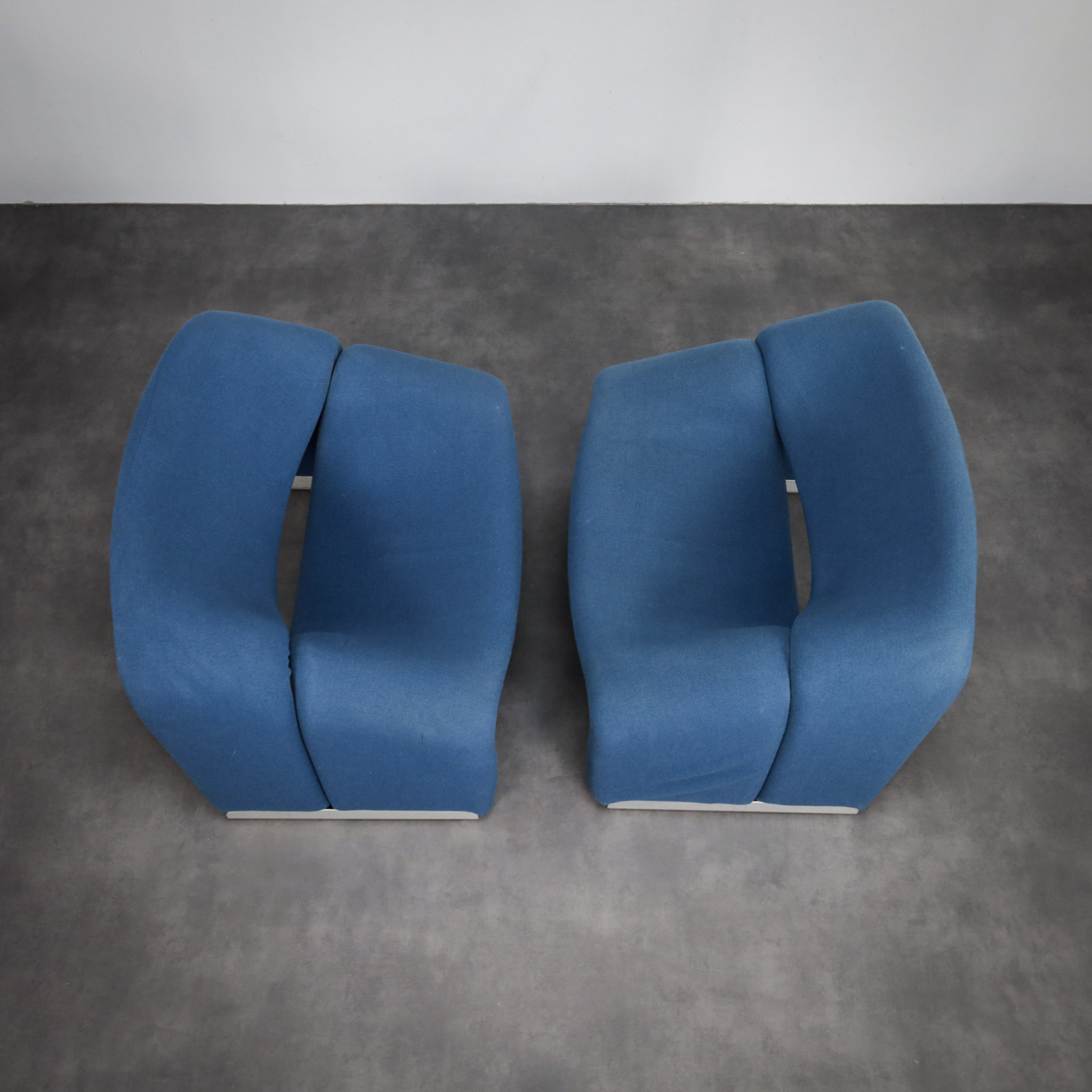 Upholstered in blue wool, this pair retains a calm yet expressive presence. The subtle, even fading of the fabric speaks to authenticity and age, enhancing the sculptural quality rather than detracting from it. As a pair, the Groovy chairs create a powerful visual statement equally suited to a curated modernist interior, a gallery setting, or a bold contemporary space.