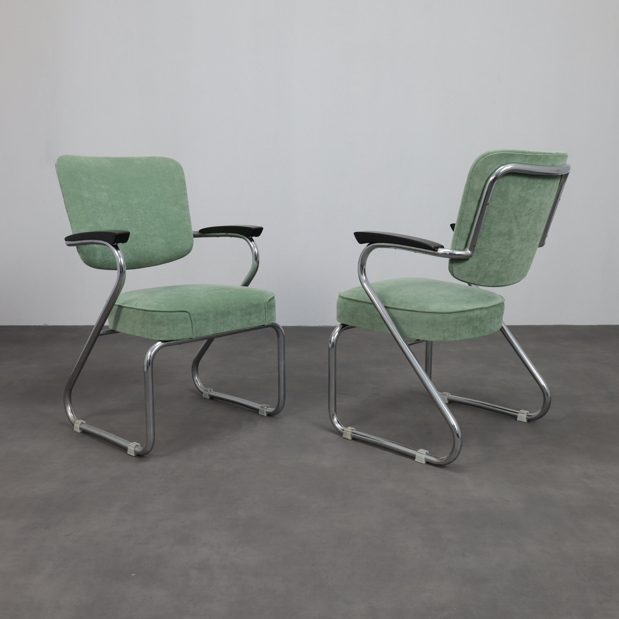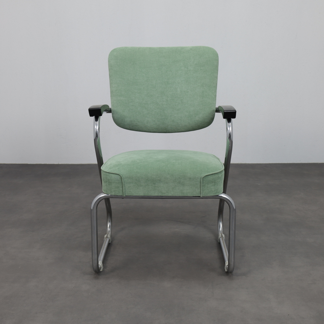 This pair features a trare continuous tube backres, a design detail that significantly elevates its collectability and places it among the more exceptional examples of Schuitema’s furniture designs.