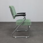 This particular set is distinguished by its continuous tubular steel back construction, a highly uncommon and seldom-seen variant. The uninterrupted flow of the chromed steel tube creates a refined linear rhythm, emphasizing movement, balance, and industrial precision. The contrast between the cool metal frame, warm upholstered seat and backrest, and original Bakelite armrests results in a composition that is both sculptural and highly functional.