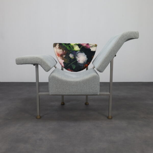 The seat is upholstered in grey/light blue fabric, while the backrest features a unique and highly exclusive print, setting it apart from standard editions. With its generous proportions and bold contours, the chair stands as both functional seating and sculptural object.