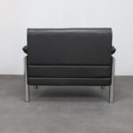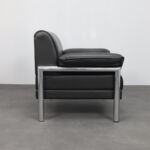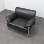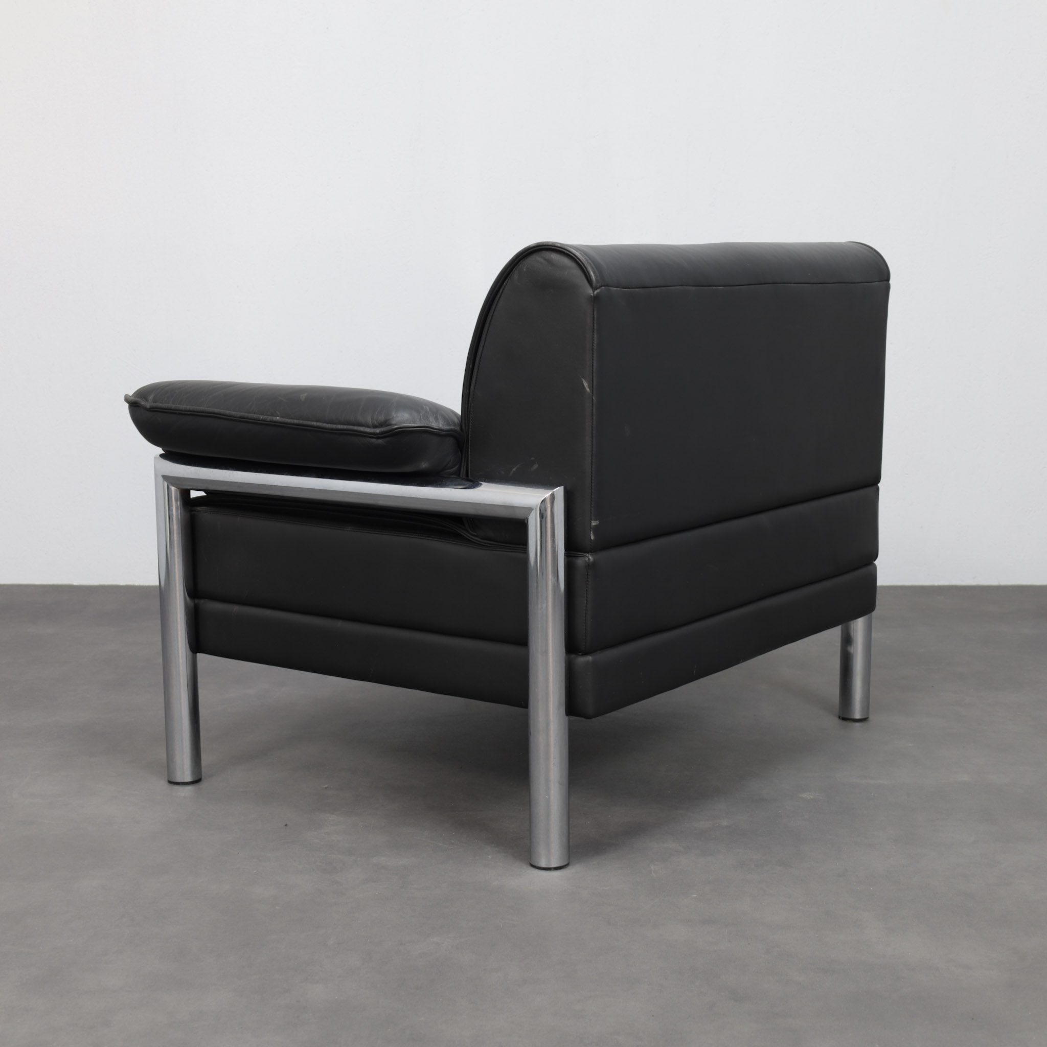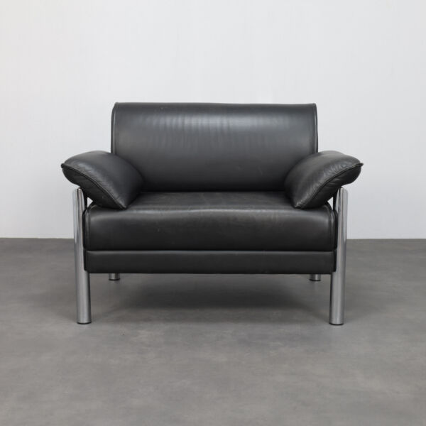 A strong and confident example of Italian postmodern seating design from the 1980s, this lounge chair combines generous proportions with a clear architectural structure. The bold cylindrical chrome frame contrasts beautifully with the deep black leather upholstery, creating a composition that feels both graphic and inviting.