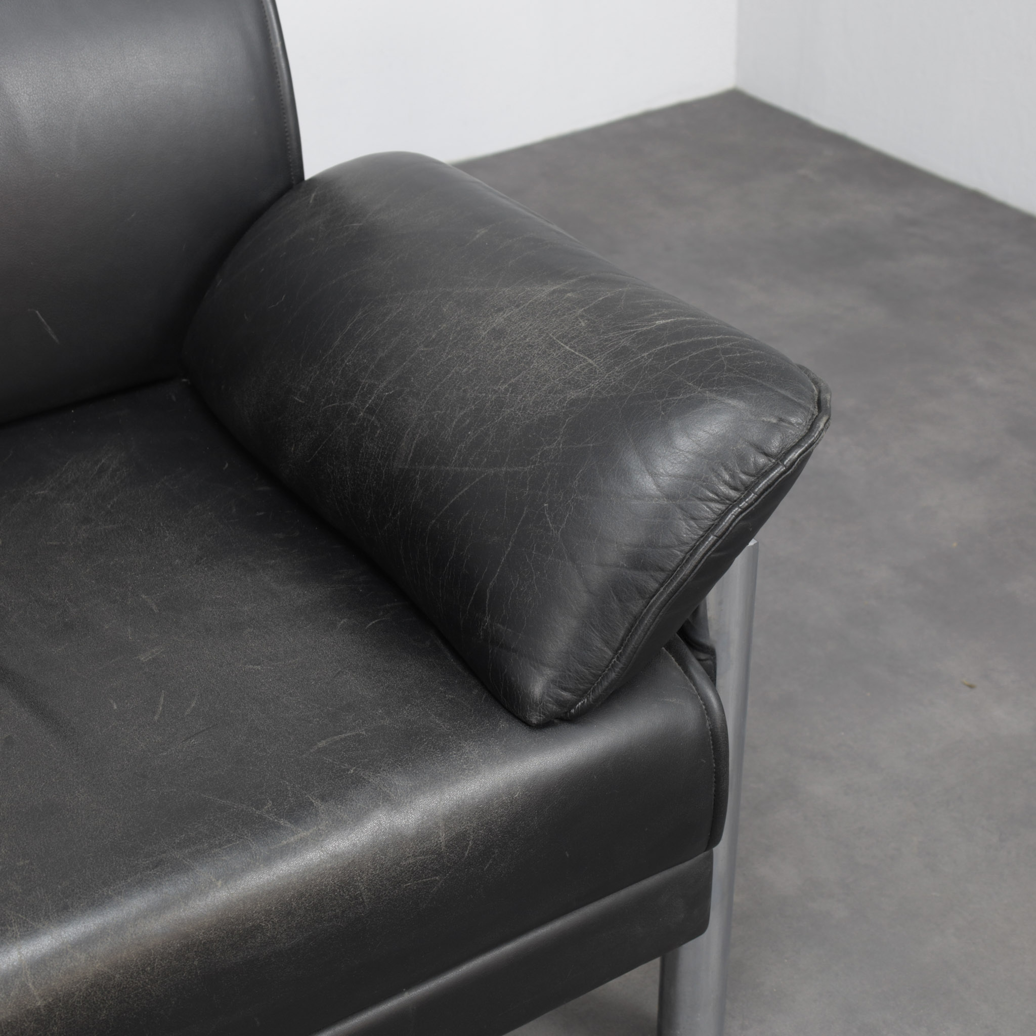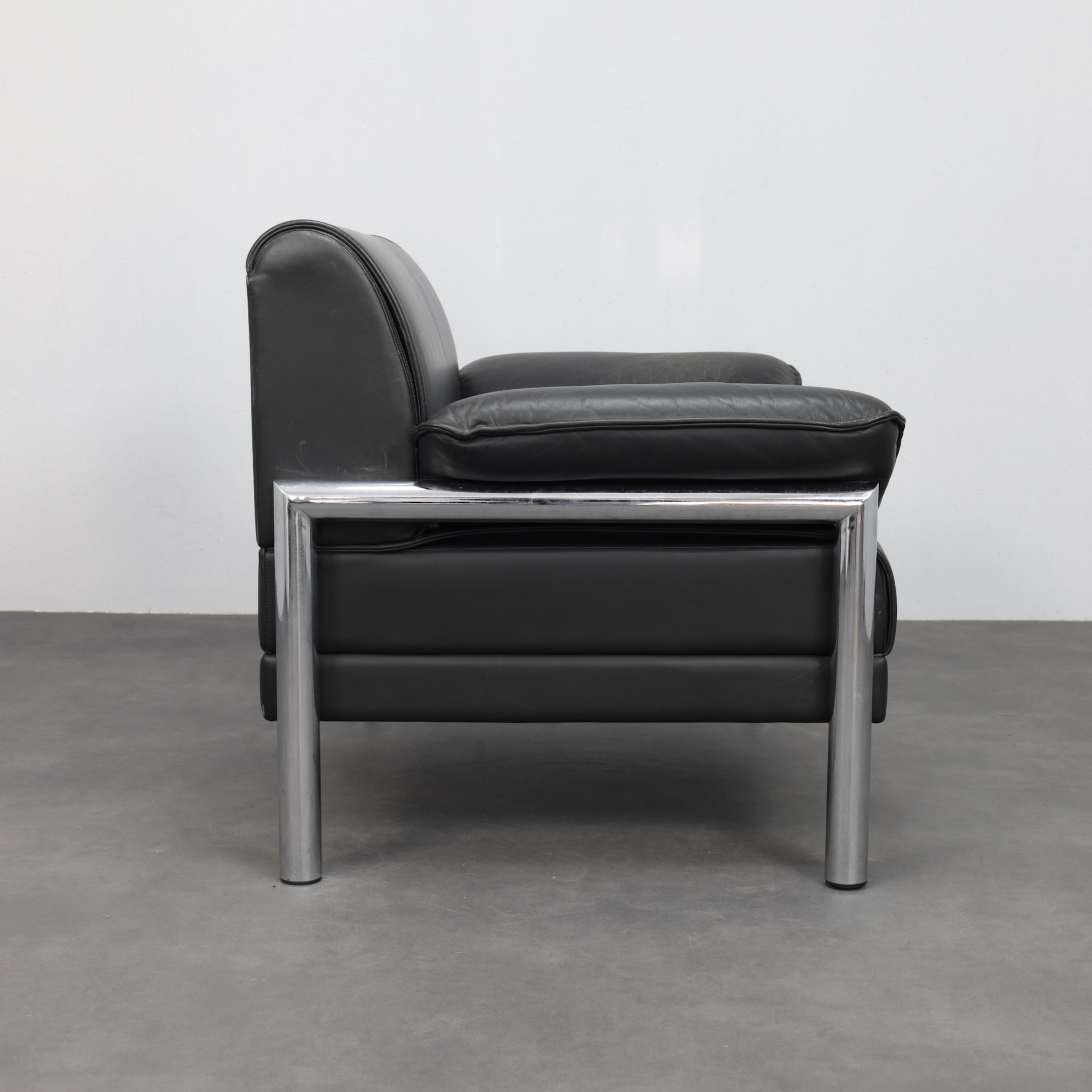 The softly padded seat, backrest, and arm cushions offer a relaxed, lounge-oriented comfort, while the exposed chromed metal legs give the chair a distinctly modern edge. This balance between softness and structure is characteristic of Italian design from the late twentieth century, where comfort was elevated through sculptural form and high-quality materials.