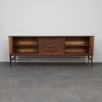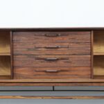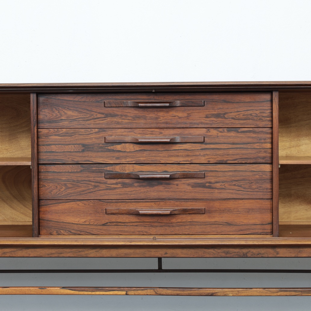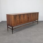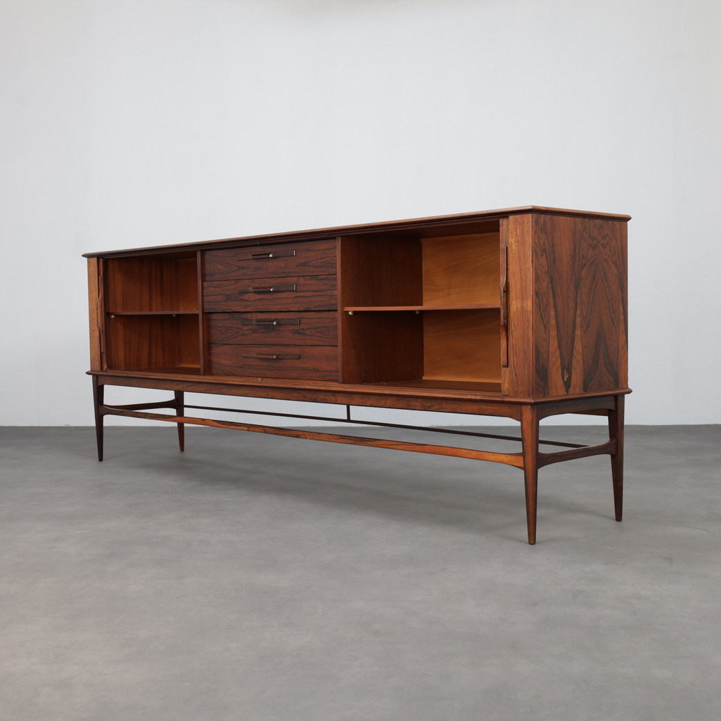 This elegant sideboard exemplifies the refined craftsmanship of mid-century Danish design. Executed in richly grained rosewood, the cabinet presents a striking symmetry across its four doors, the natural patterns of the veneer creating a sense of rhythm and depth. The jalousie (tambour) doors slide seamlessly into the sides of the cabinet, a sophisticated and space-efficient solution that enhances its sleek appearance. Raised on slender tapered legs with a stretcher base, the piece balances visual lightness with functional solidity. Inside, generous storage makes it as practical as it is sculptural—a timeless expression of Danish modernism’s fusion of form and function.