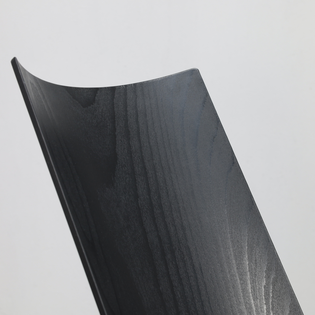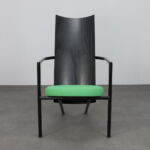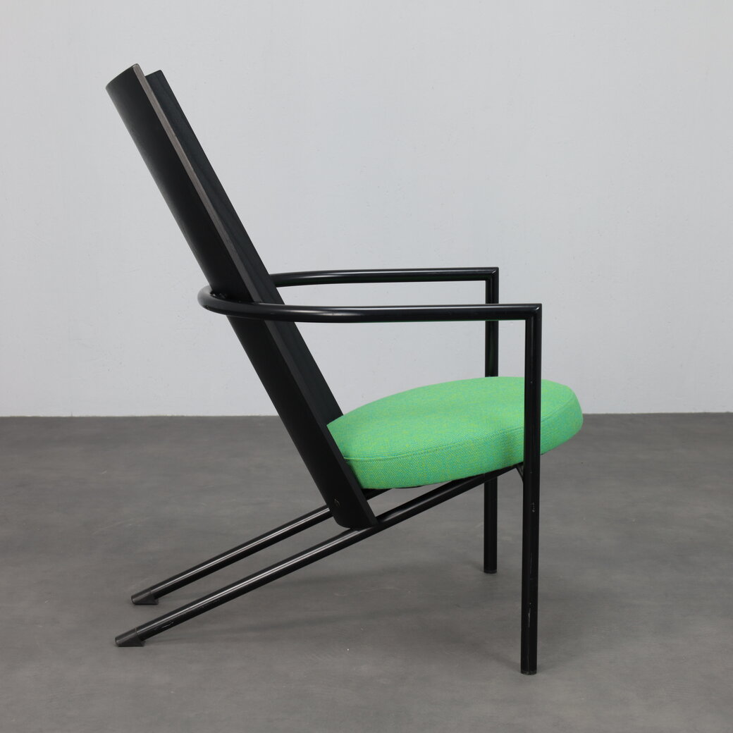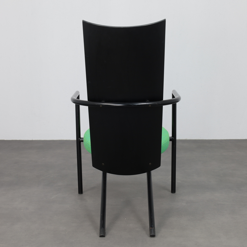 A striking pair of postmodern armchairs from the 1980s, defined by their sculptural silhouette and sharp, architectural lines. The high, curved backrest in black-stained wood creates a bold vertical presence, while the graphic metal frame gives the chairs a structural, almost architectural precision.