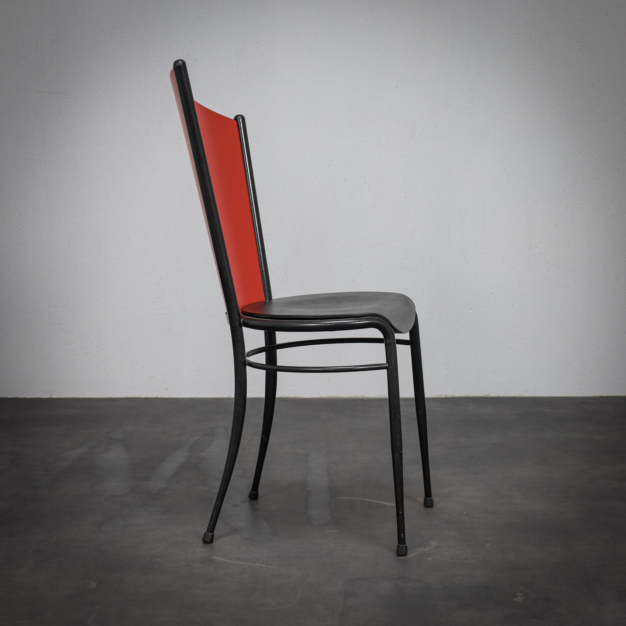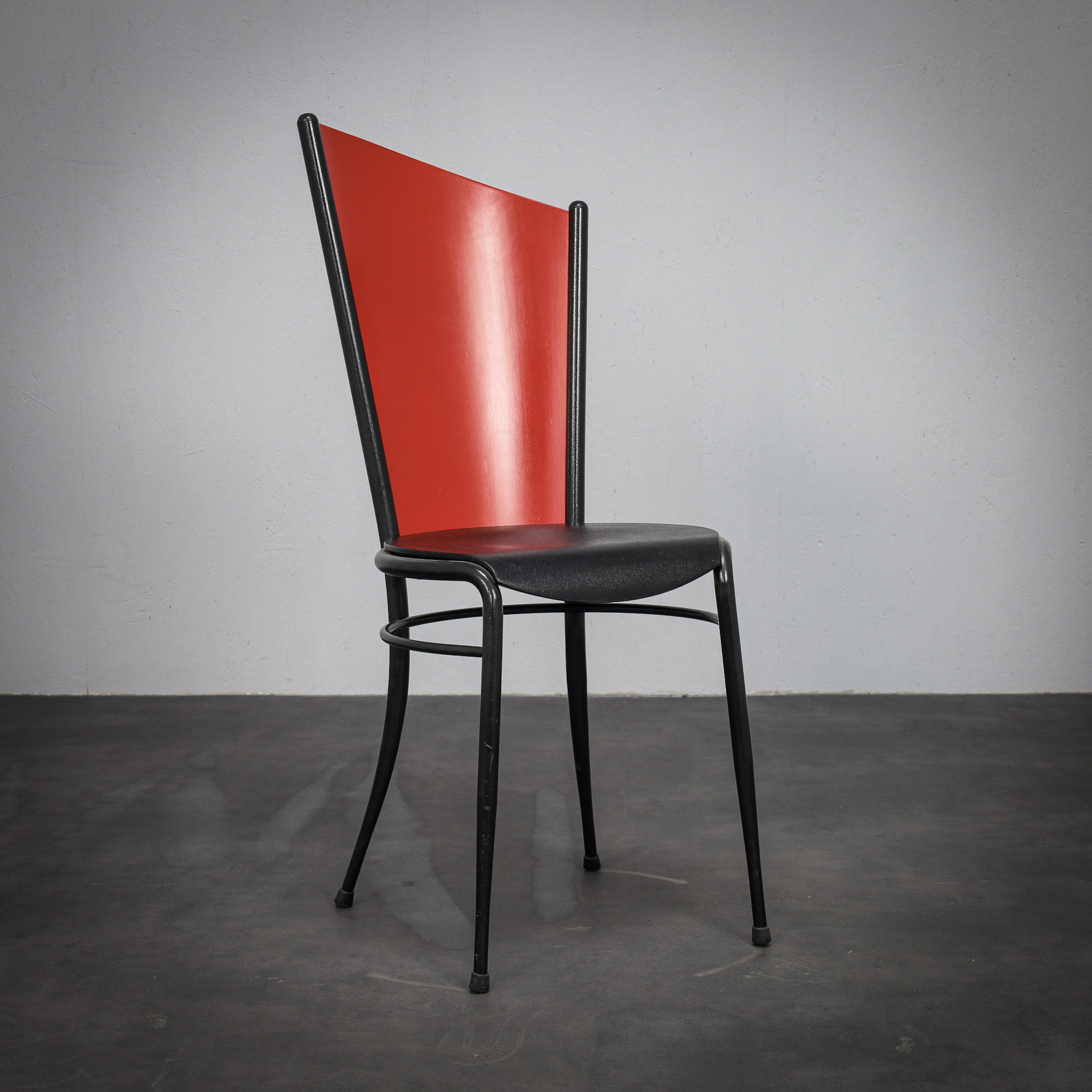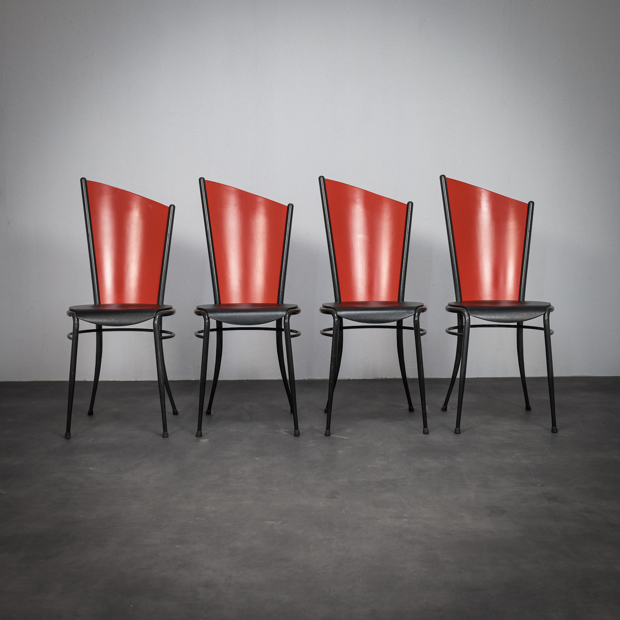 A striking set of four postmodern dining chairs, produced in Italy during the 1980s. The design is defined by its bold contrast of materials and color, where vivid red backrests meet a slender black metal frame.