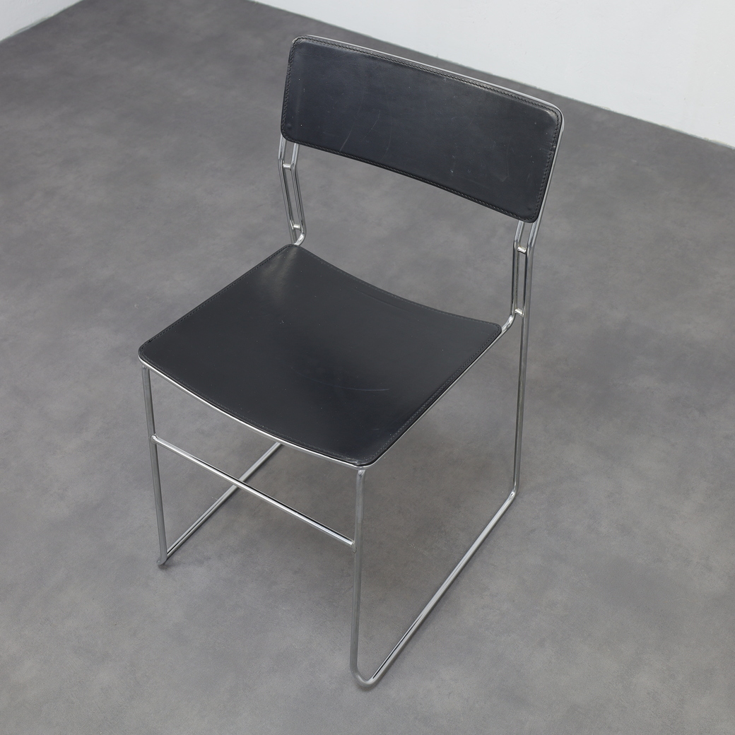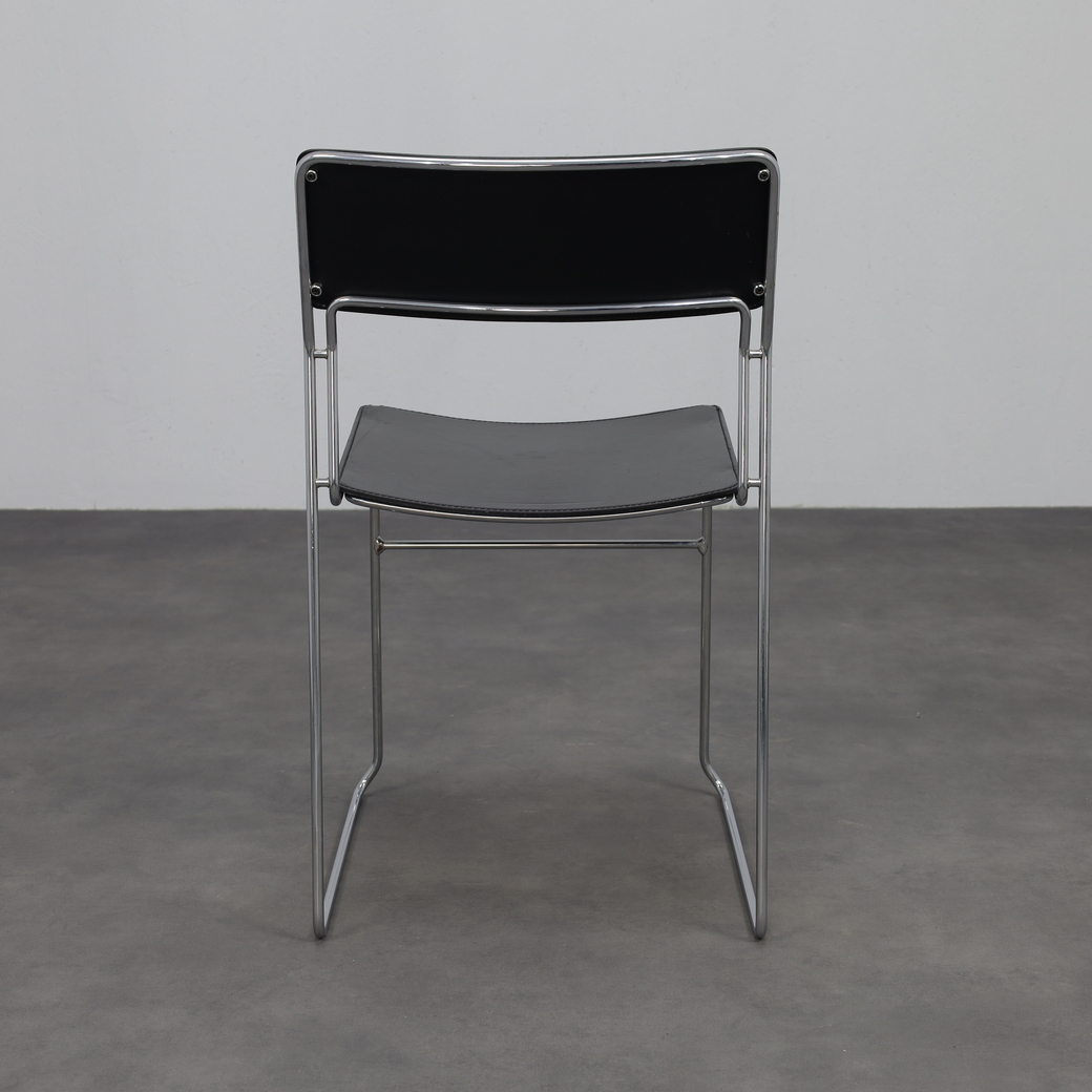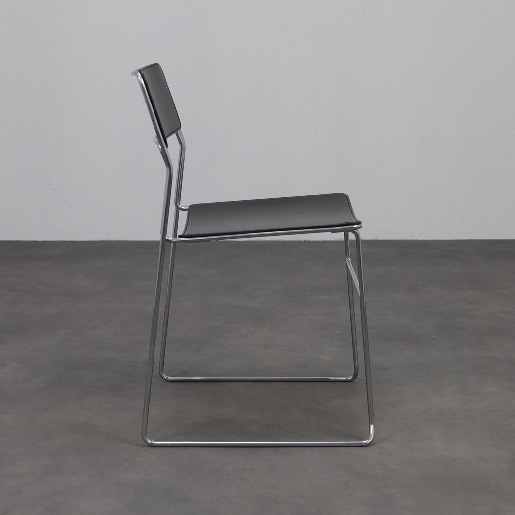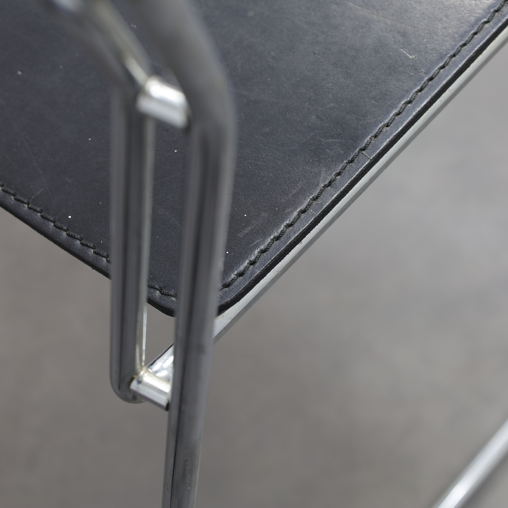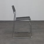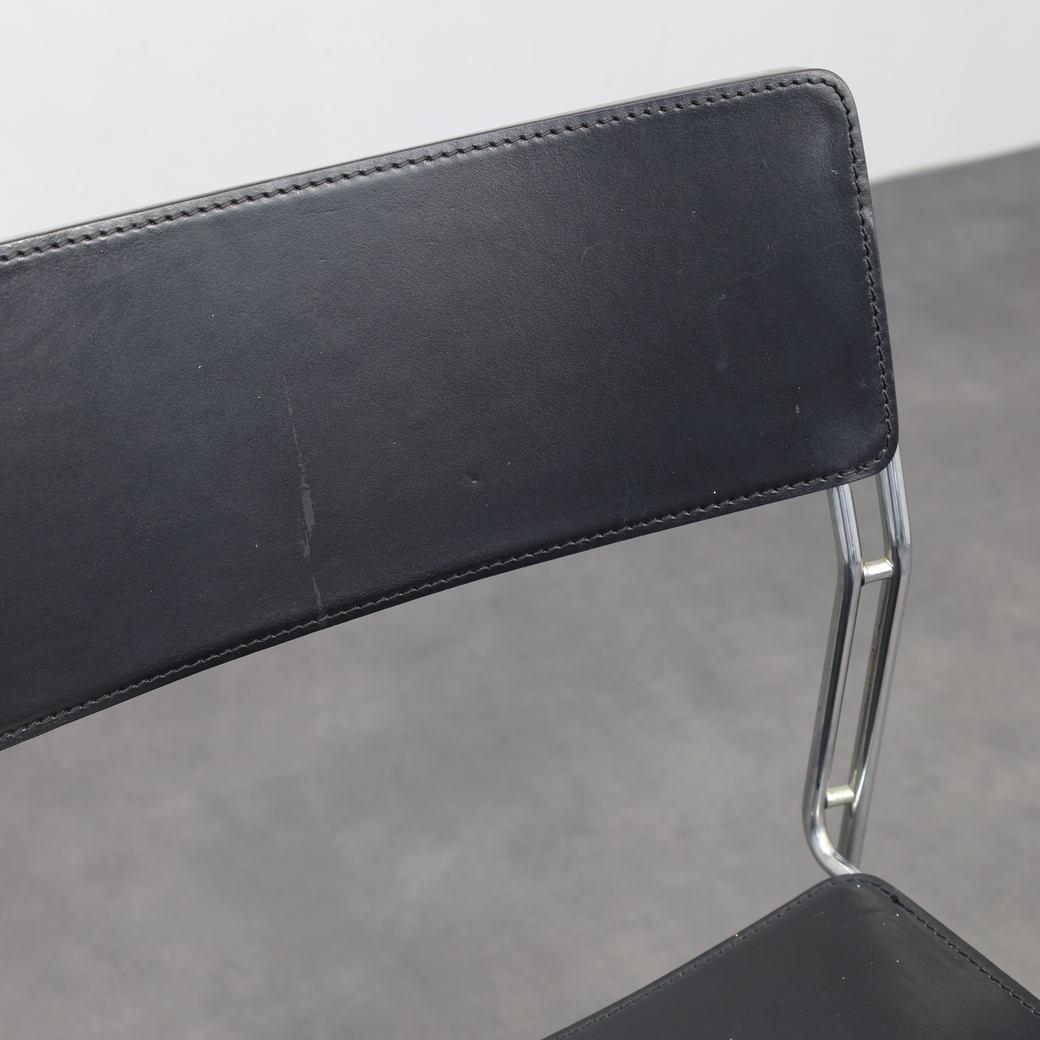 These sleek dining chairs showcase the elegant minimalism characteristic of Arrben’s Italian design of the 1980s. With their slender chromed metal frames and black leather seats and backs, the chairs exude a refined balance between structure and comfort. The leather patina enriches their timeless appeal, reflecting both use and authenticity, while the clean lines emphasize a modern yet versatile aesthetic. Perfect around a dining table or as statement chairs in any contemporary setting.