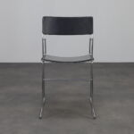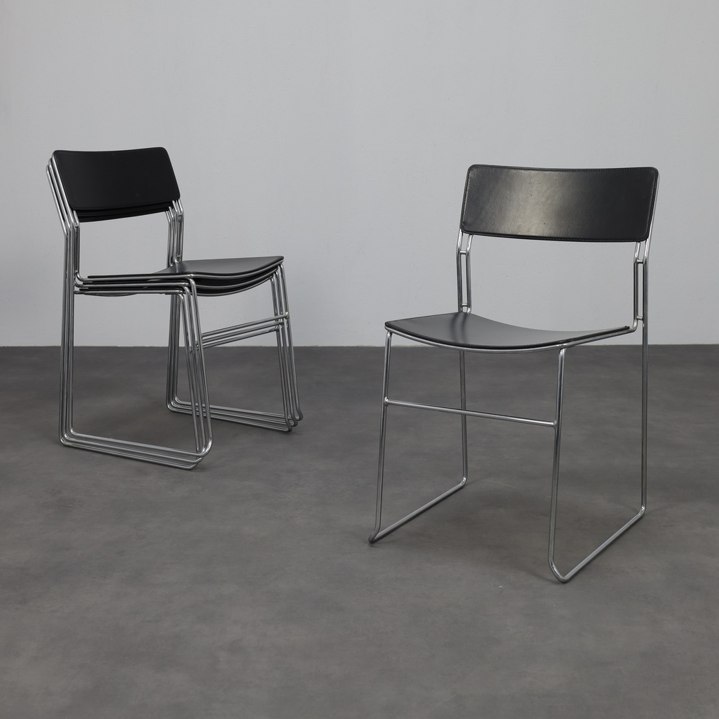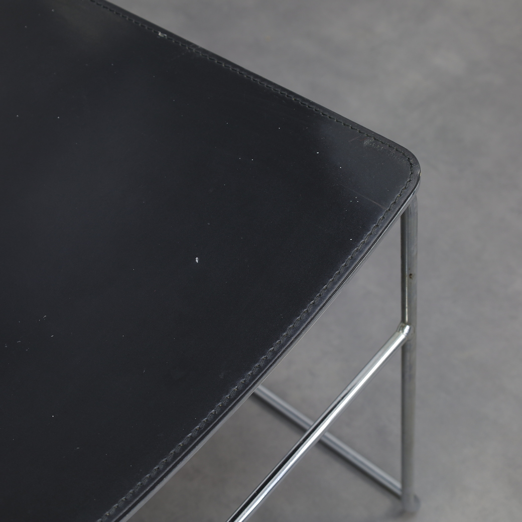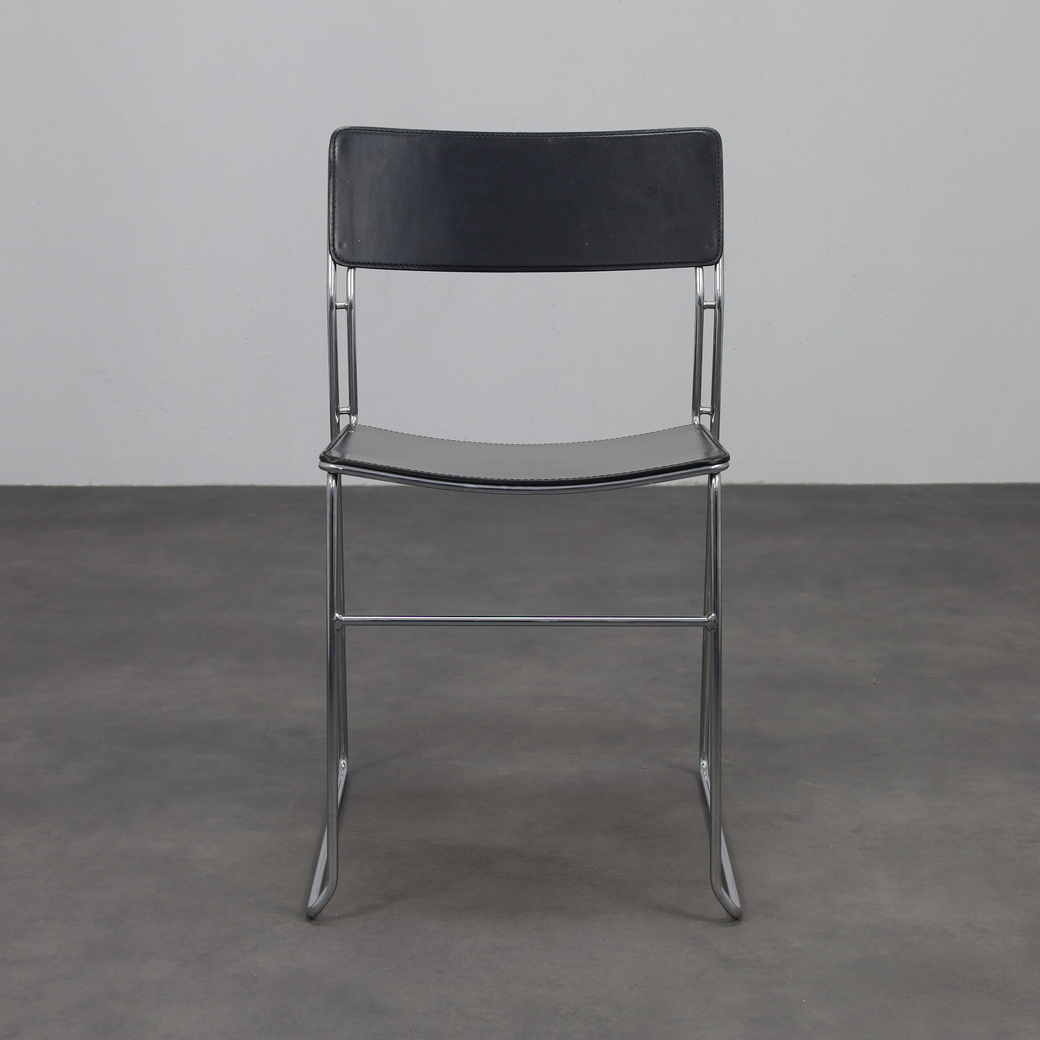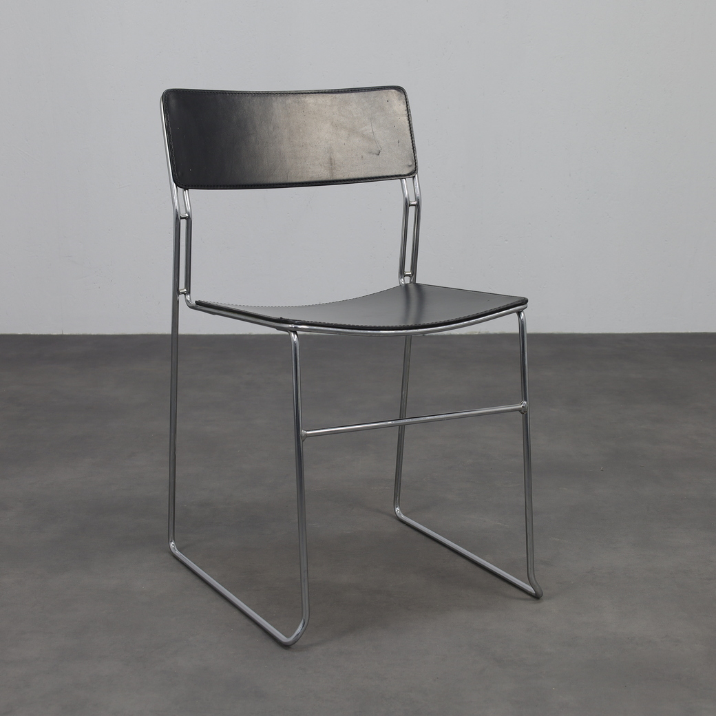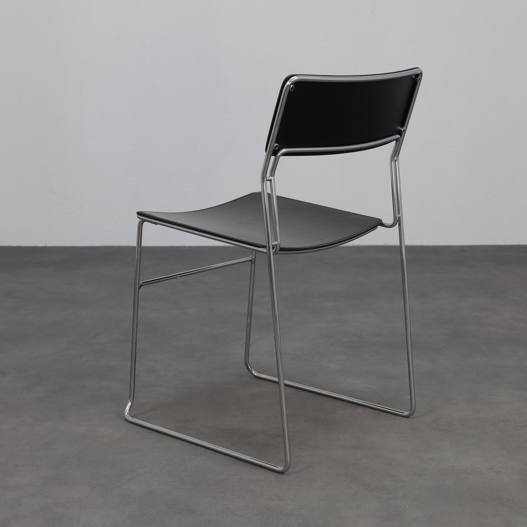 These sleek dining chairs showcase the elegant minimalism characteristic of Arrben’s Italian design of the 1980s. With their slender chromed metal frames and black leather seats and backs, the chairs exude a refined balance between structure and comfort. The leather patina enriches their timeless appeal, reflecting both use and authenticity, while the clean lines emphasize a modern yet versatile aesthetic. Perfect around a dining table or as statement chairs in any contemporary setting.
