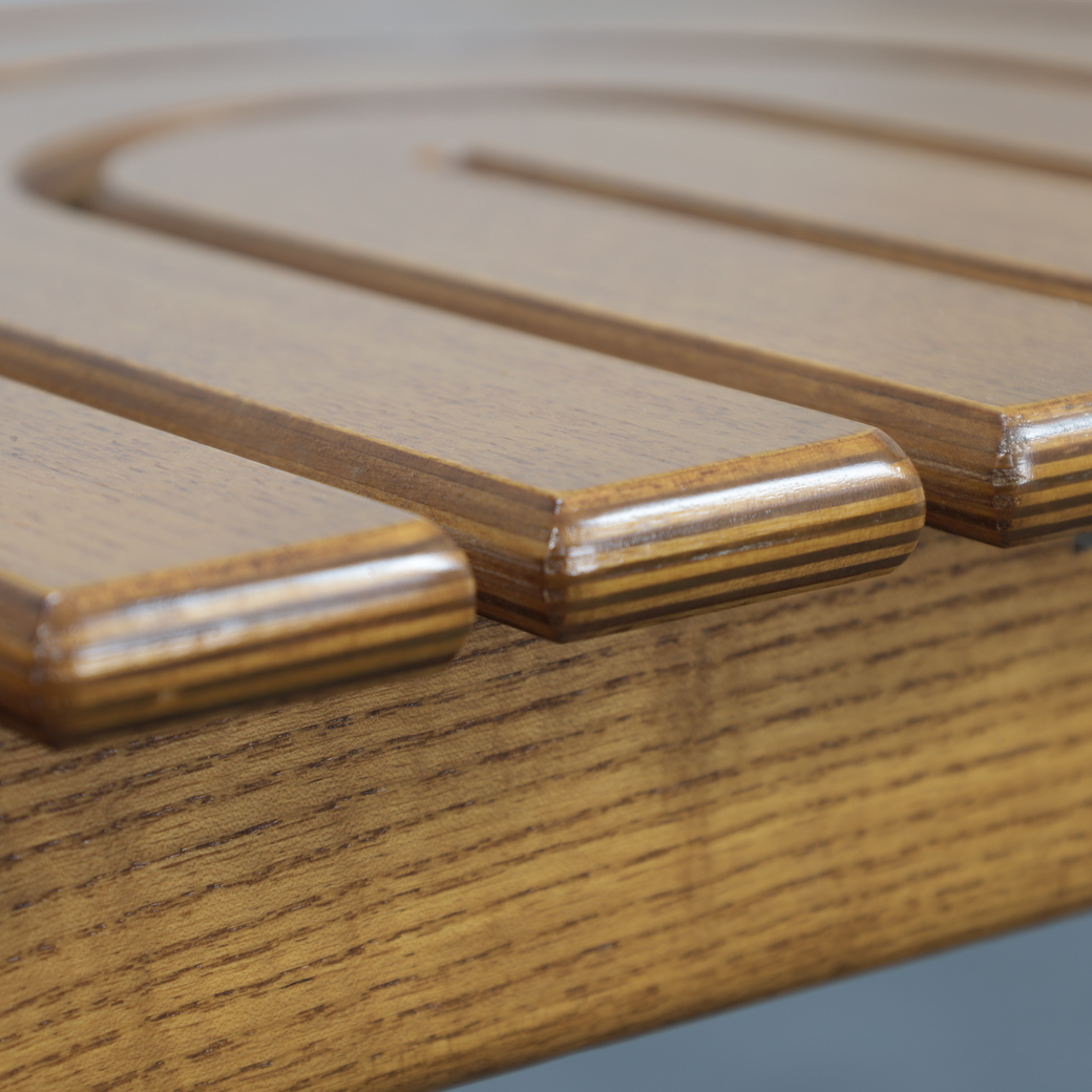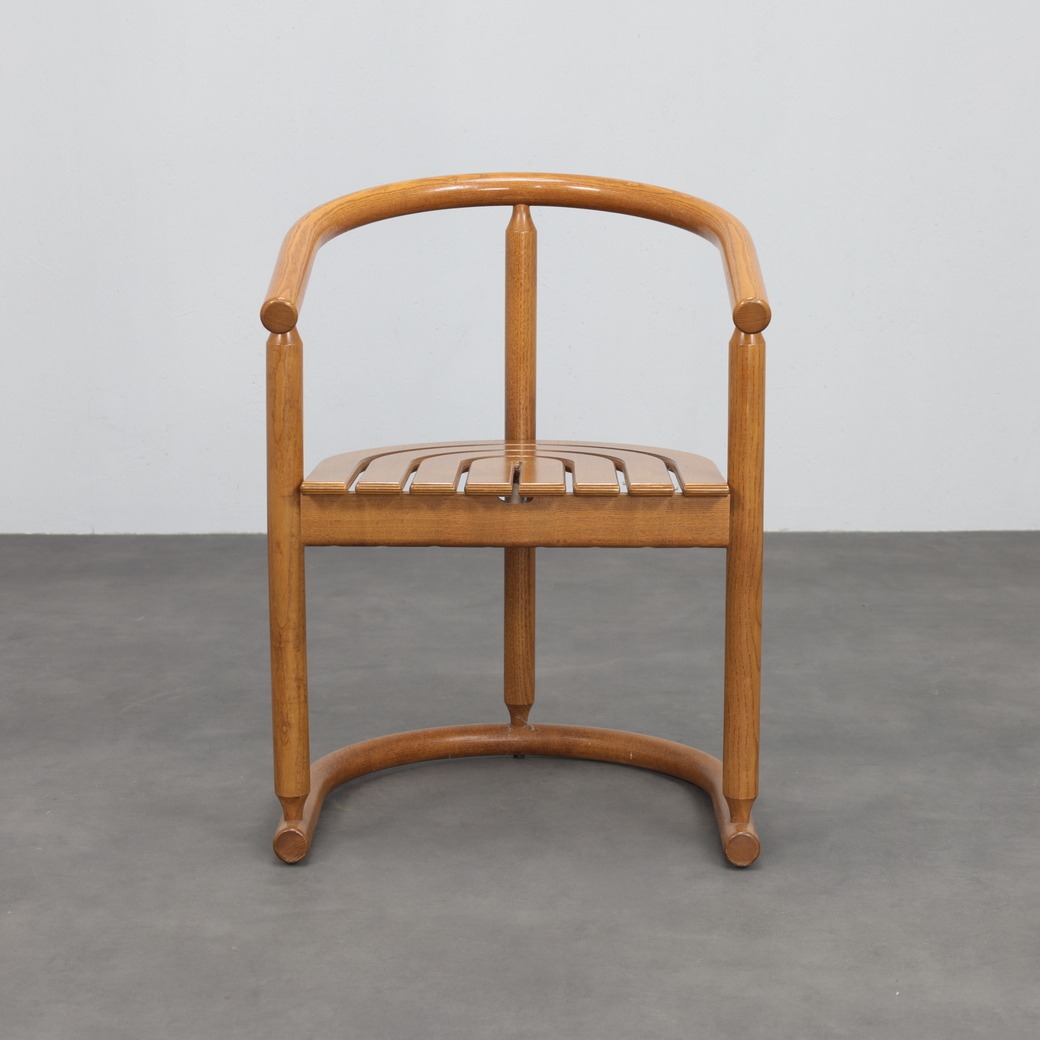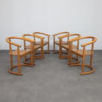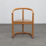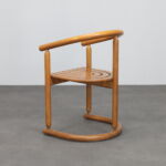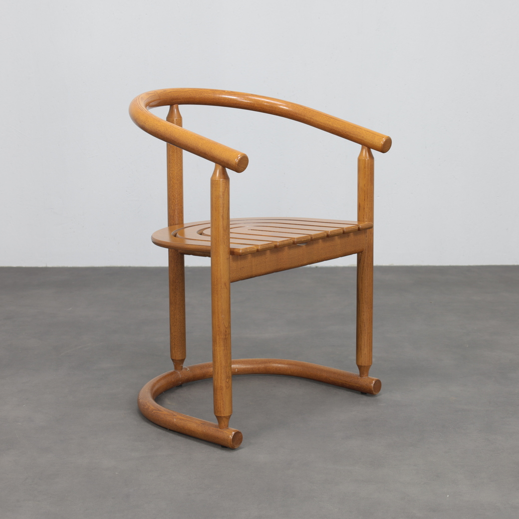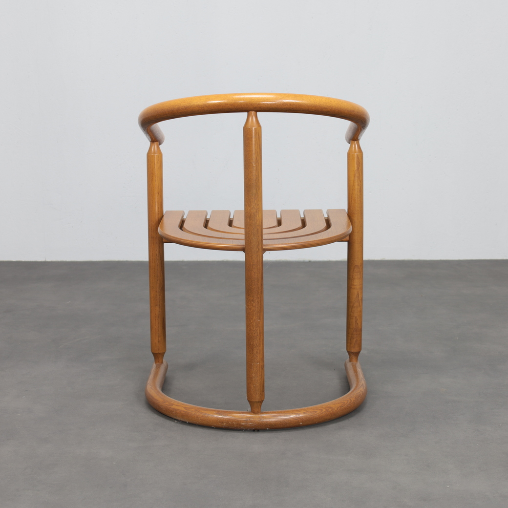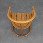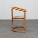 The warm wood tones and the distinctive semi-circular base create a sense of movement and harmony, making them ideal for both contemporary and eclectic interiors. The chairs have been exceptionally preserved and present with a beautiful, even patina.