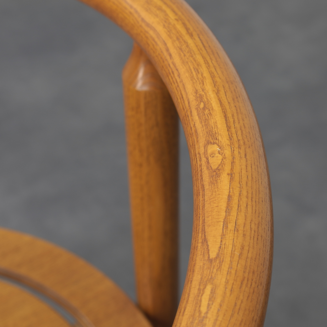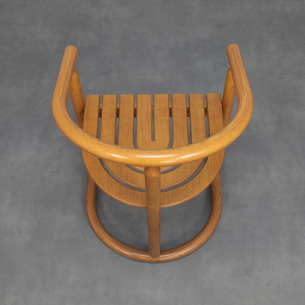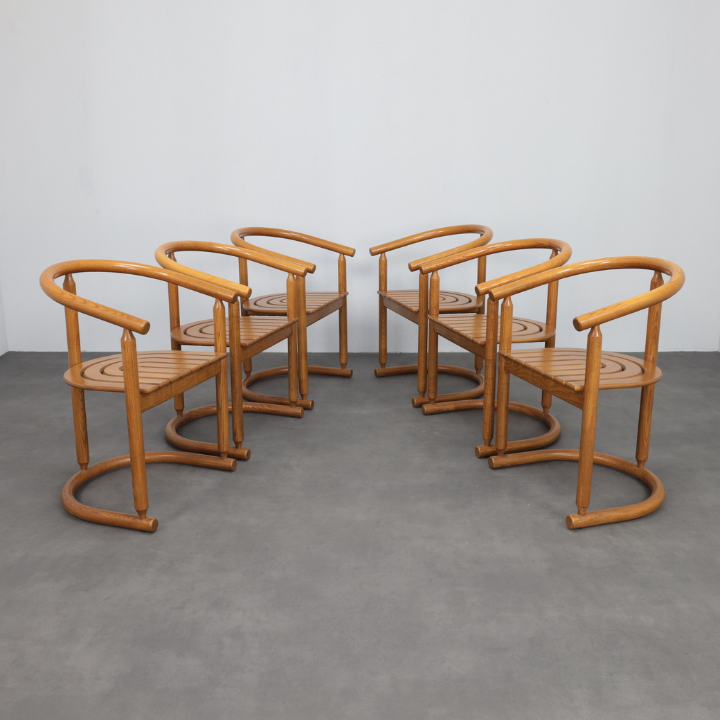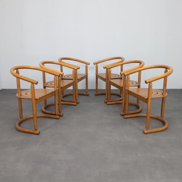 A sculptural and beautifully balanced set of six bentwood dining chairs, crafted by the renowned German manufacturer Allmilmö in the 1980s. Their elegant curved backrest, flowing continuous frame and refined joinery give these chairs a soft architectural rhythm a perfect fusion of craftsmanship and functional design.