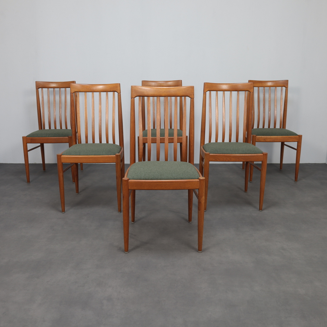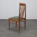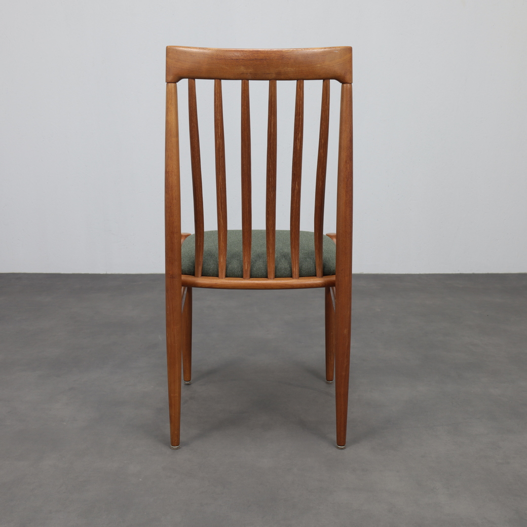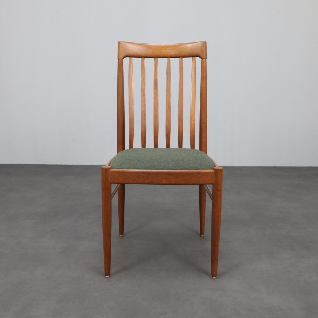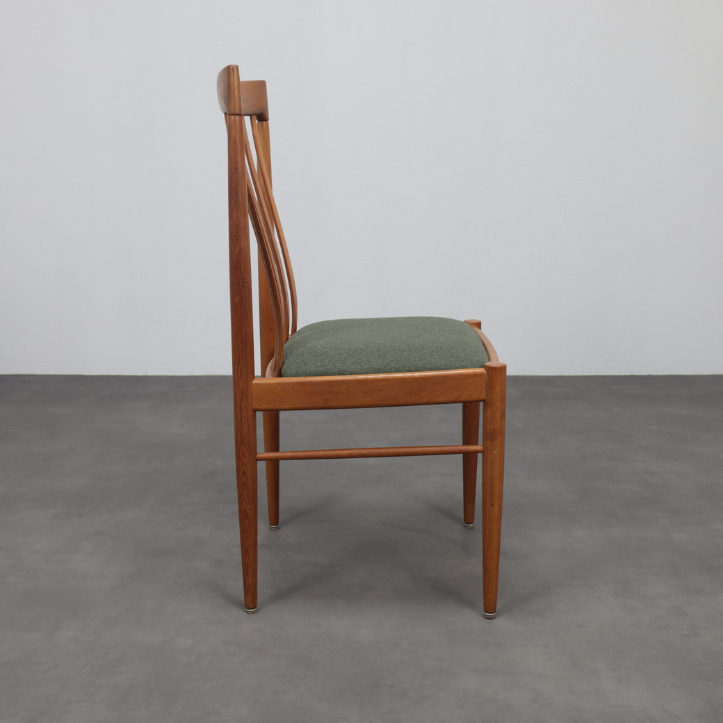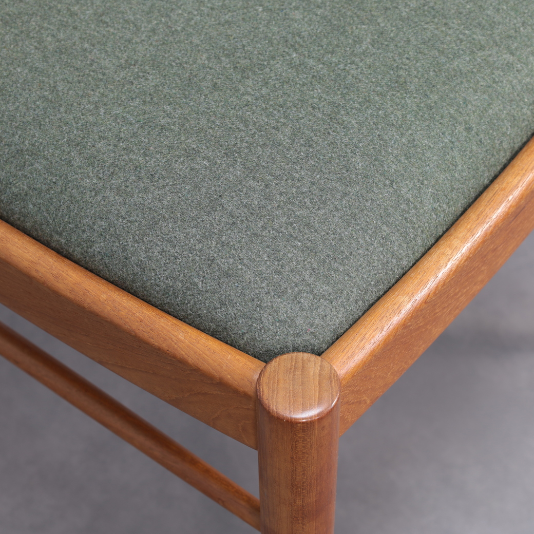 A beautifully balanced set of six dining chairs designed by Henry Walter Klein for Bramin, Denmark, 1970s. Crafted in warm teak with refined joinery and newly upholstered seats in a textured green wool fabric, these chairs exemplify the harmony and craftsmanship of Danish modern design.
