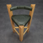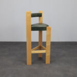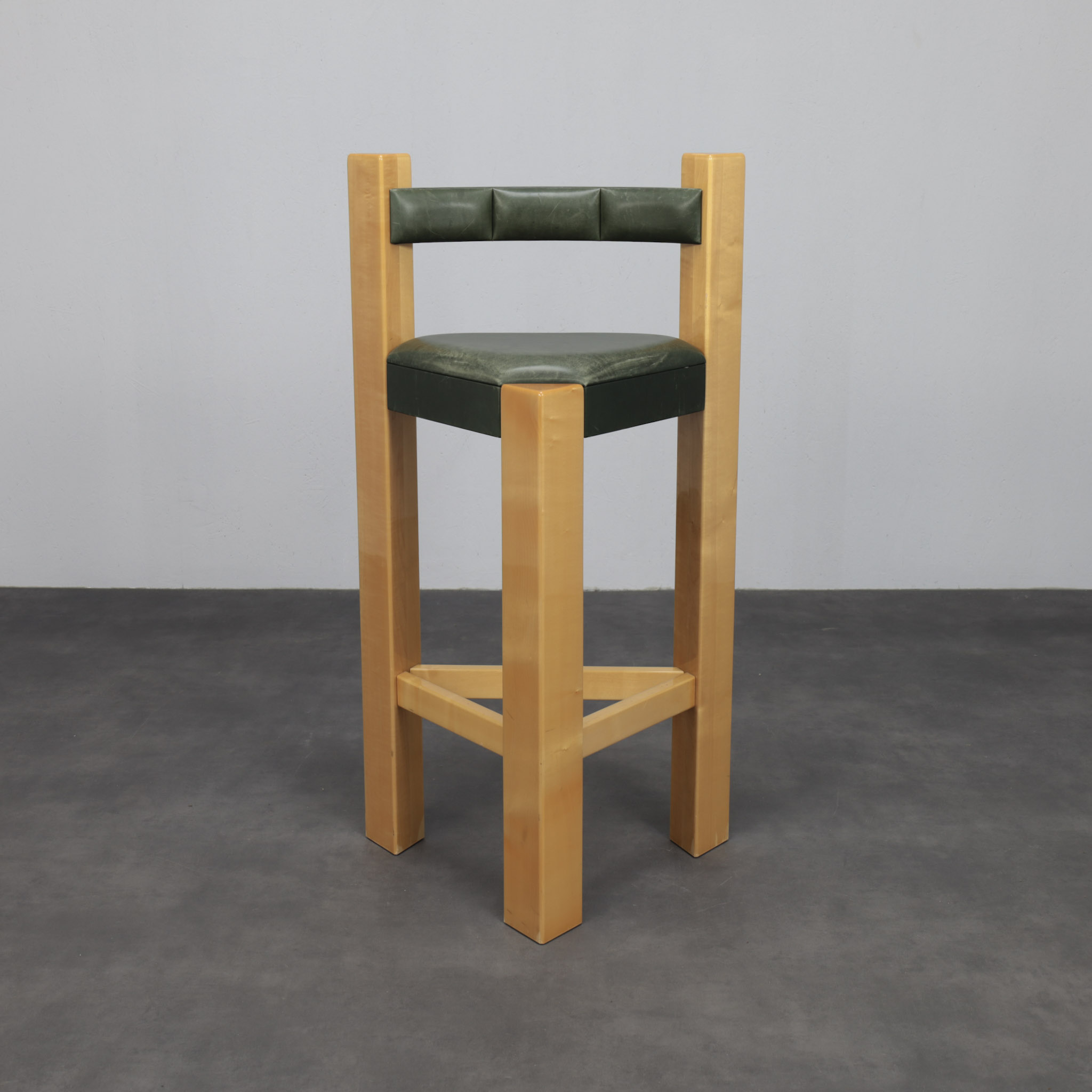 Each stool is constructed from epoxy-finished wood, giving the frame a smooth, almost lacquered surface with a subtle depth of tone. The solid rectangular legs create an architectural silhouette, reinforced by a triangular stretcher that stabilises the composition. The green leather seat and backrest introduce contrast — softening the strict lines while adding tactile richness.