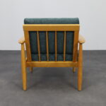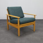 Vintage Danish lounge chair from the 1970s, featuring a solid wood frame with gently rounded armrests. Newly upholstered in deep teal fabric, it offers a fresh and refined aesthetic. The design reflects the quiet functionality of Scandinavian modernism, combining comfort with understated craftsmanship.